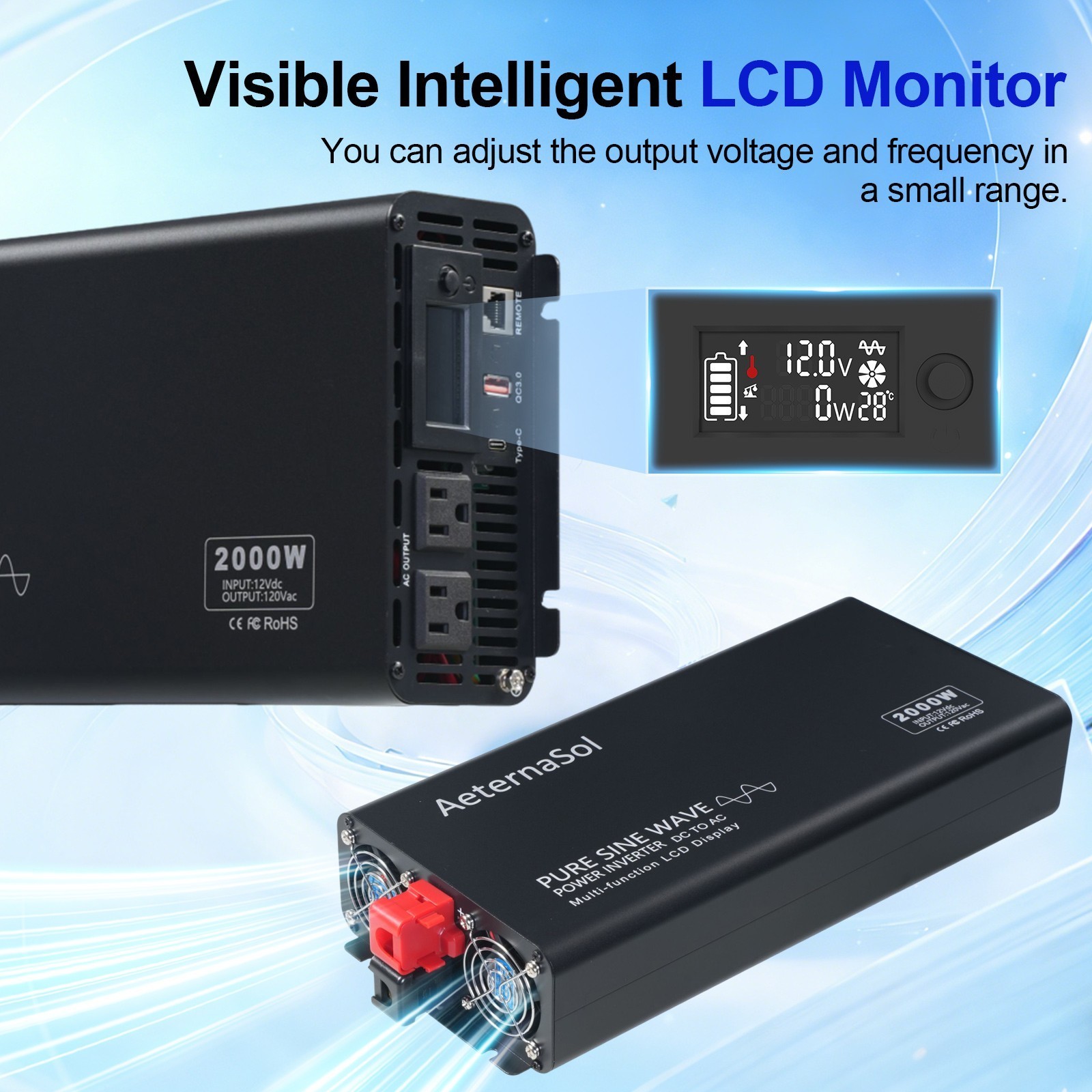 2000W Pure Sine Wave Inverter 12V DC to 120V AC Converter Remote Power Inverter