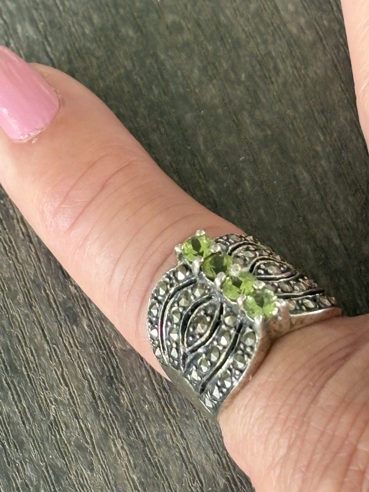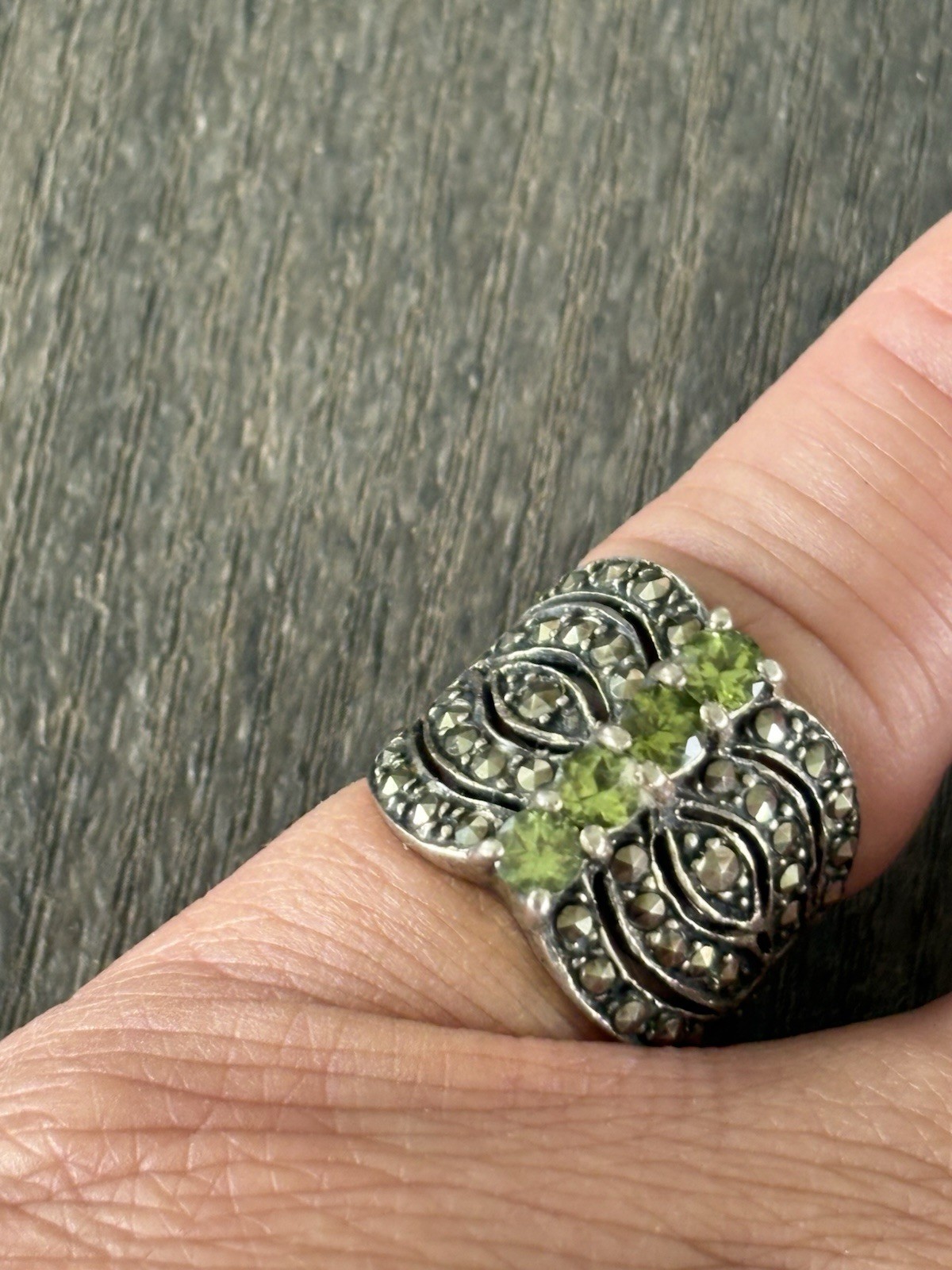 как выглядит Peridot 925 Sterling Silver Marcasite 4 Row Wide Band Ring 5.9 Gram Sz 5.75 фото