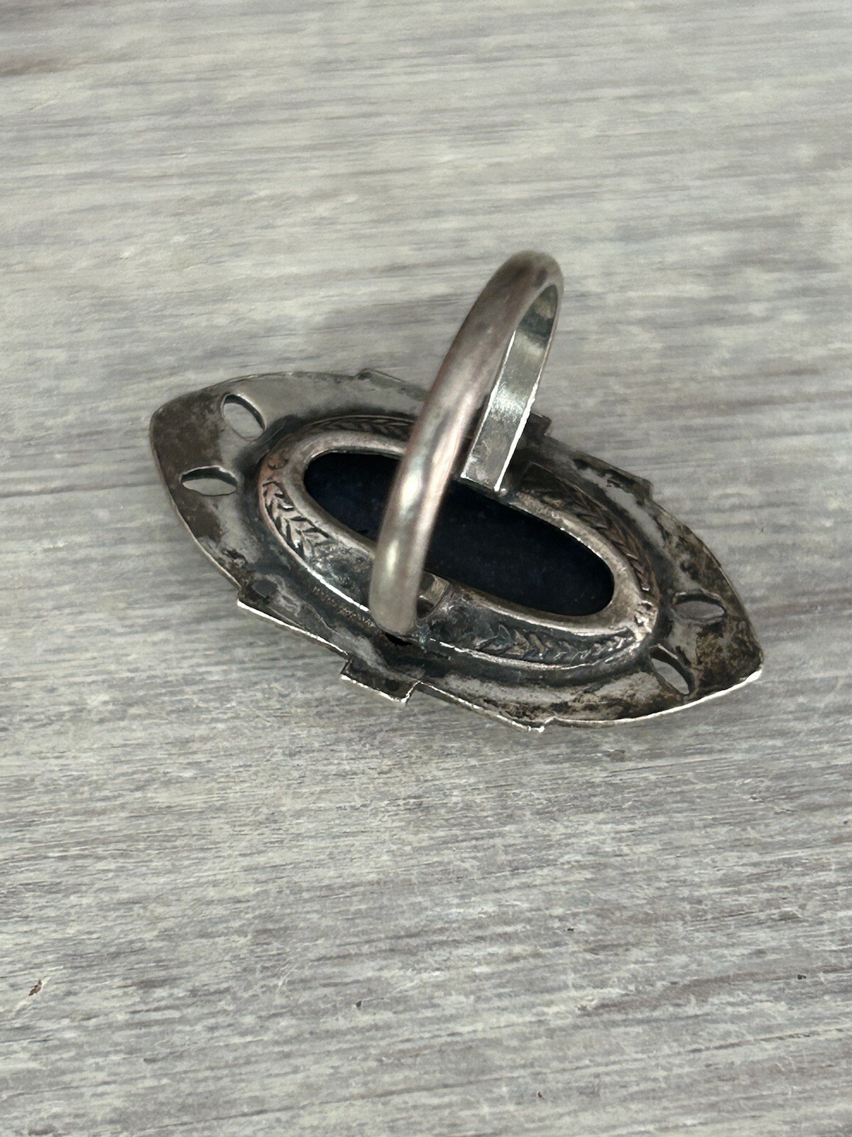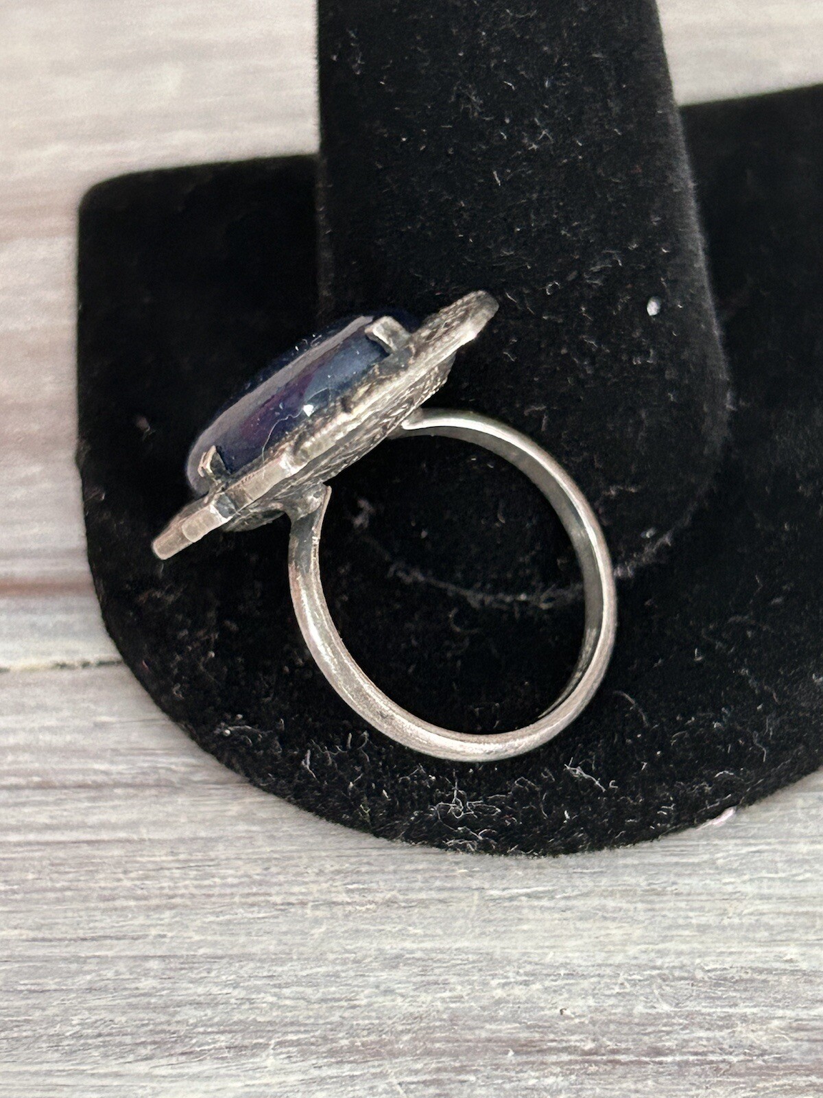 Sterling Silver Ring Large Blue Center Stone Marcasite Setting Size 5.75 53