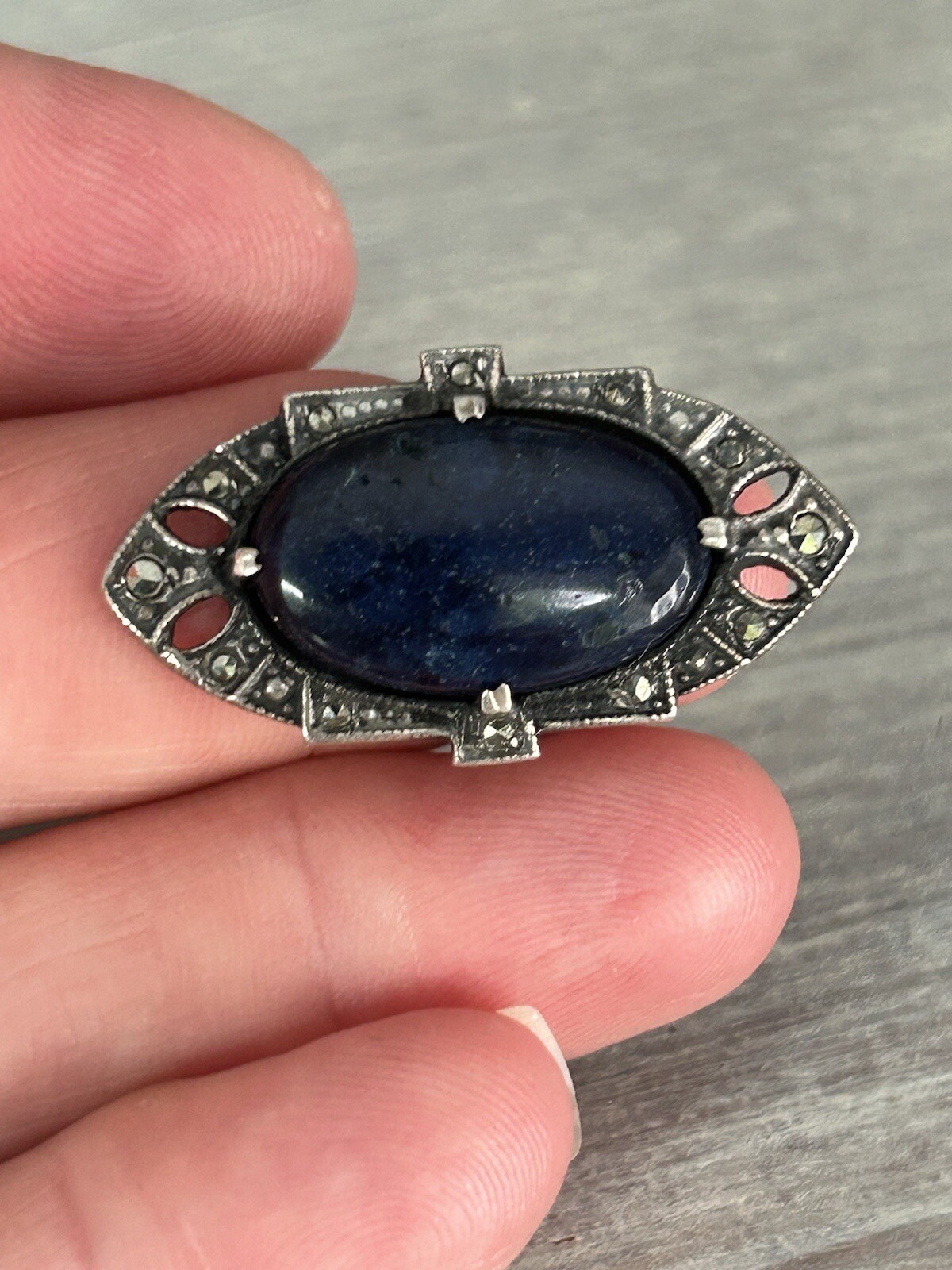 как выглядит Sterling Silver Ring Large Blue Center Stone Marcasite Setting Size 5.75 53 фото