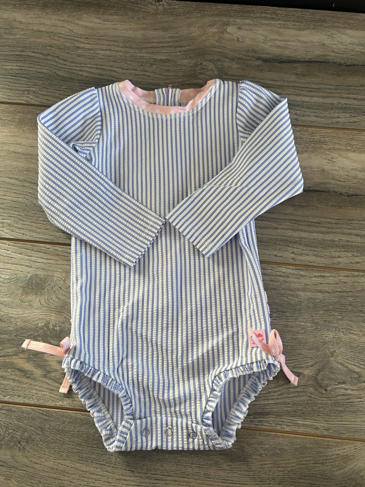 Ruffle Butts 2T Blue Pink Long Sleeve One Piece Rash Guard Swimsuit Swim EUC