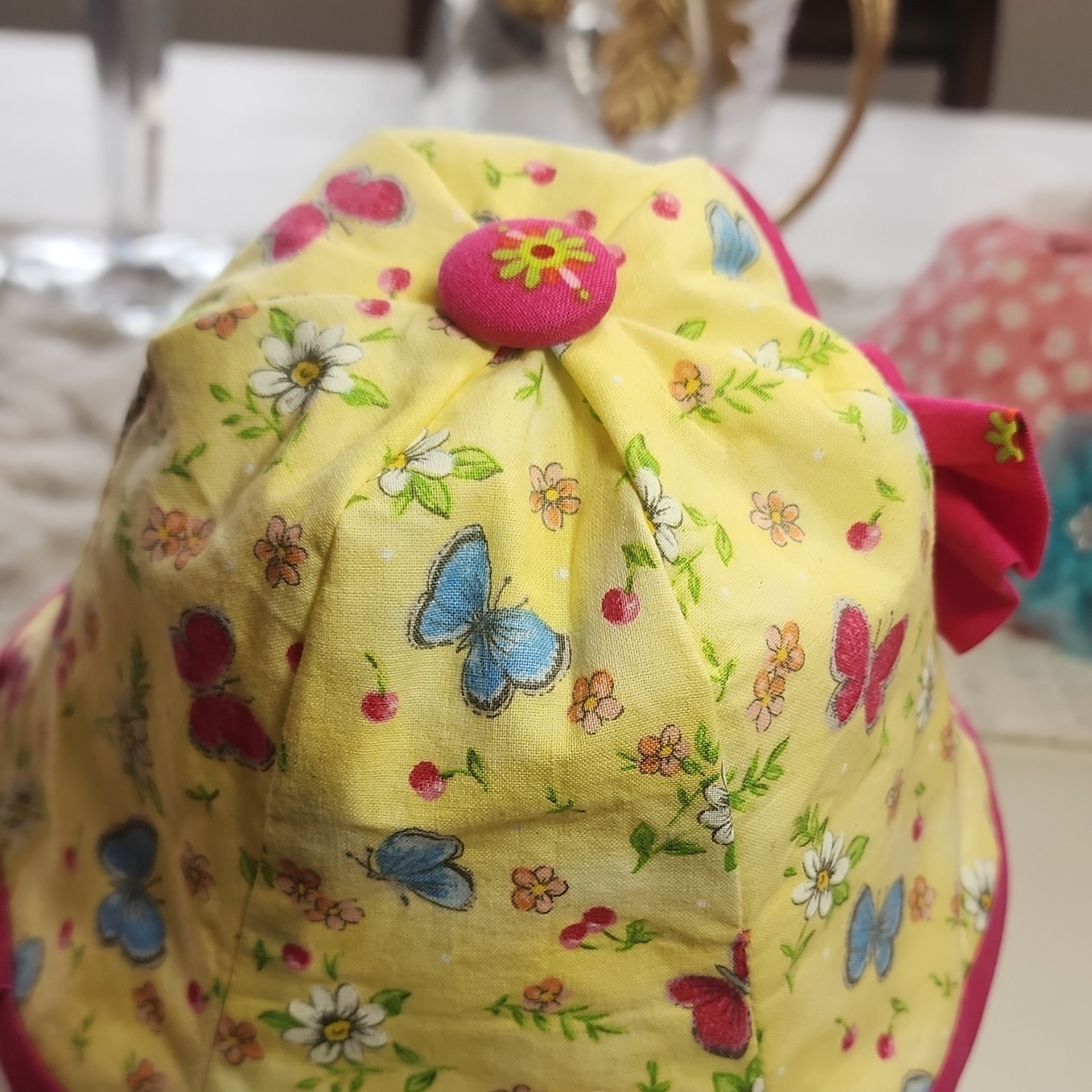 как выглядит NEWGirlsYellow Floral Butterfly Cotton Bucket Hat with Pink Bow Button Accent фото