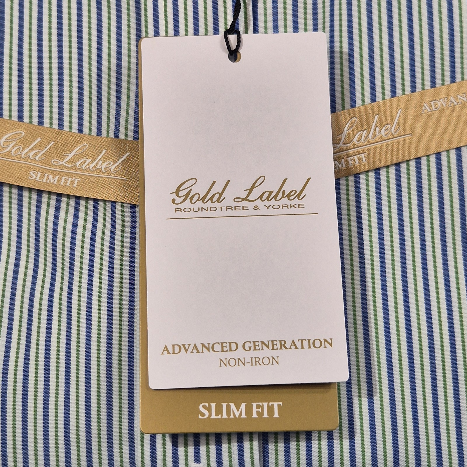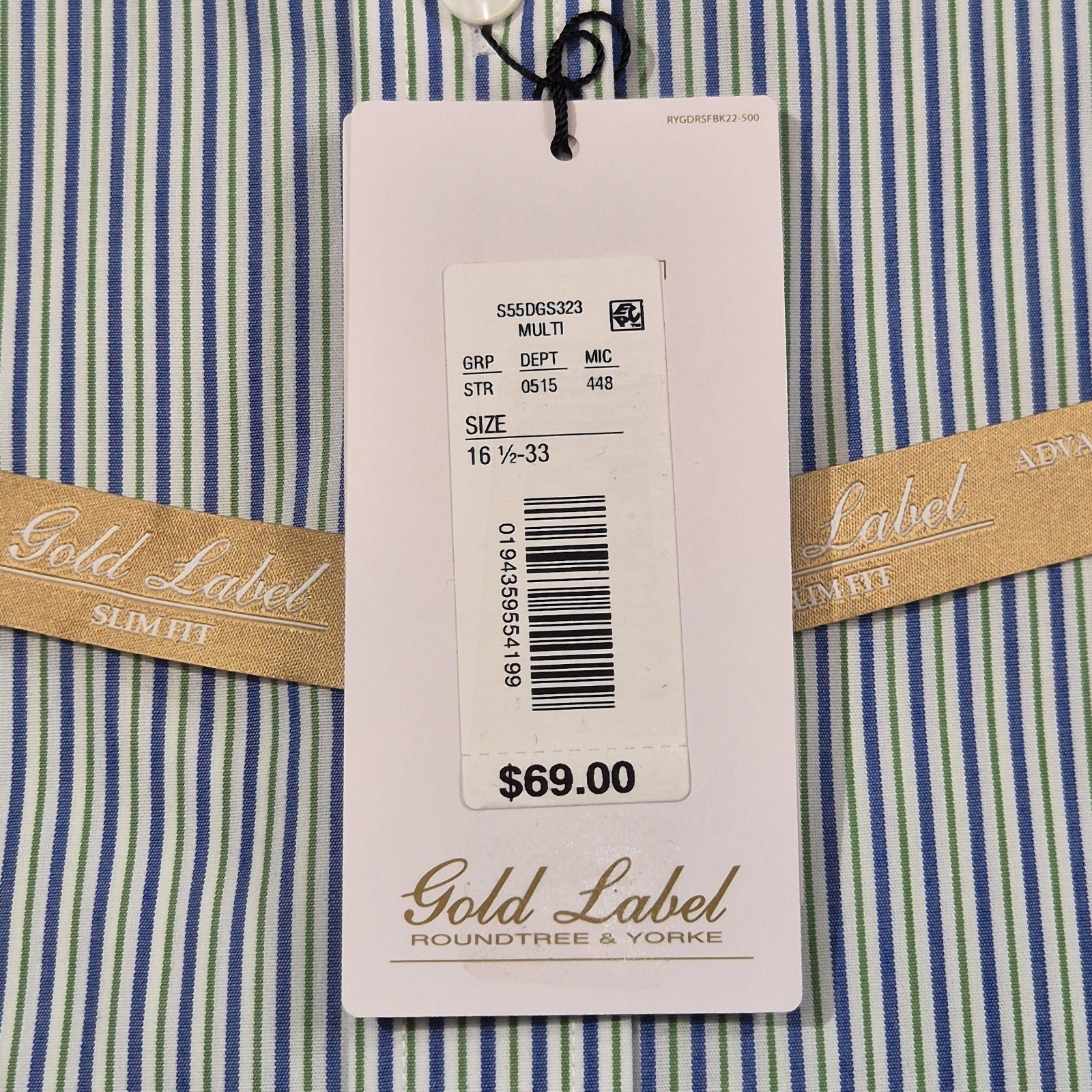 Roundtree Yorke Gold Label Men Shirt Size 16.5 33 Blue Green Poplin Slim Fit 62