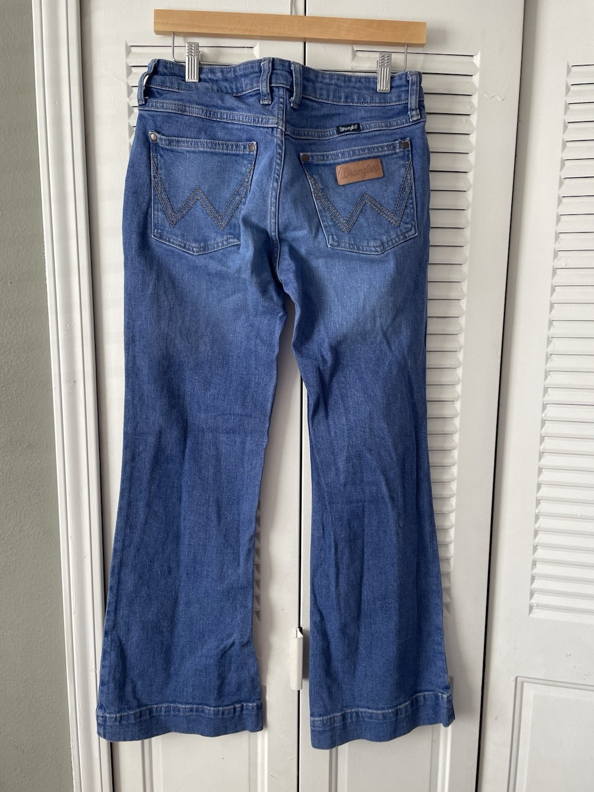 как выглядит Wrangler Retro Bootcut Jeans Women Blue Medium Wash Denim Button Zip Pockets фото