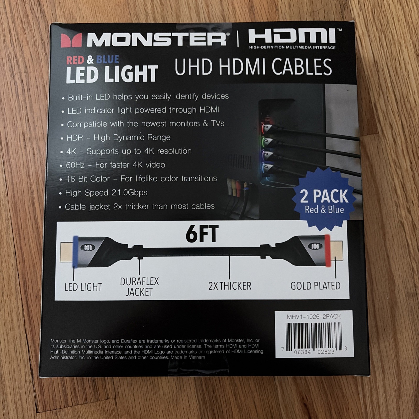 Monster 4K HDR 6' High Speed HDMI Cable w/ Build-In LED Light - 2 pk. Red Blue