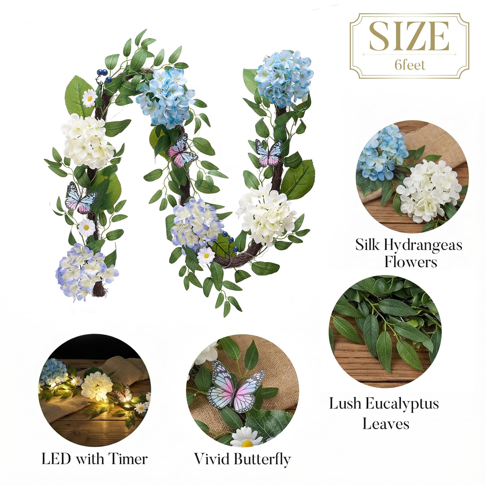 Included Components: Hydrangeas, Butterfly, Eucalyptus Leaves