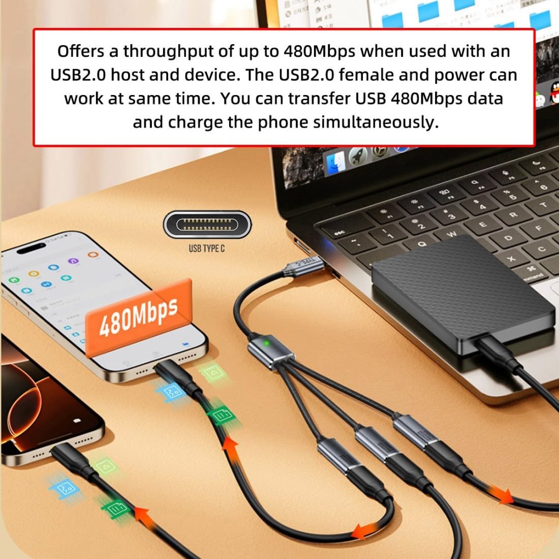 chenyang 3 in 1 USB 2.0 Splitter Cable,USB C 1 to 3 HUB Cable Support Black