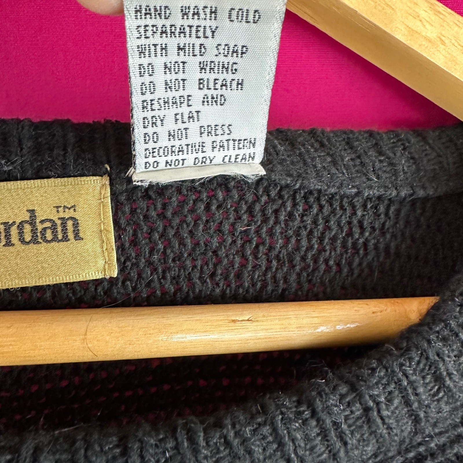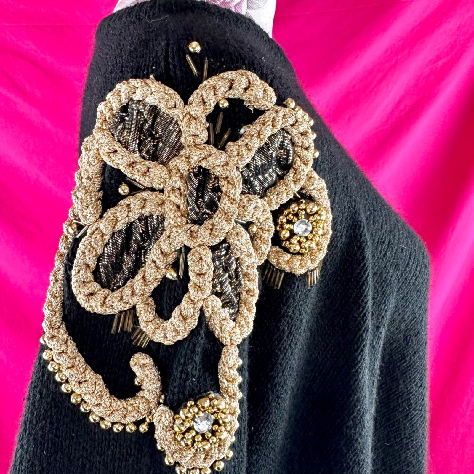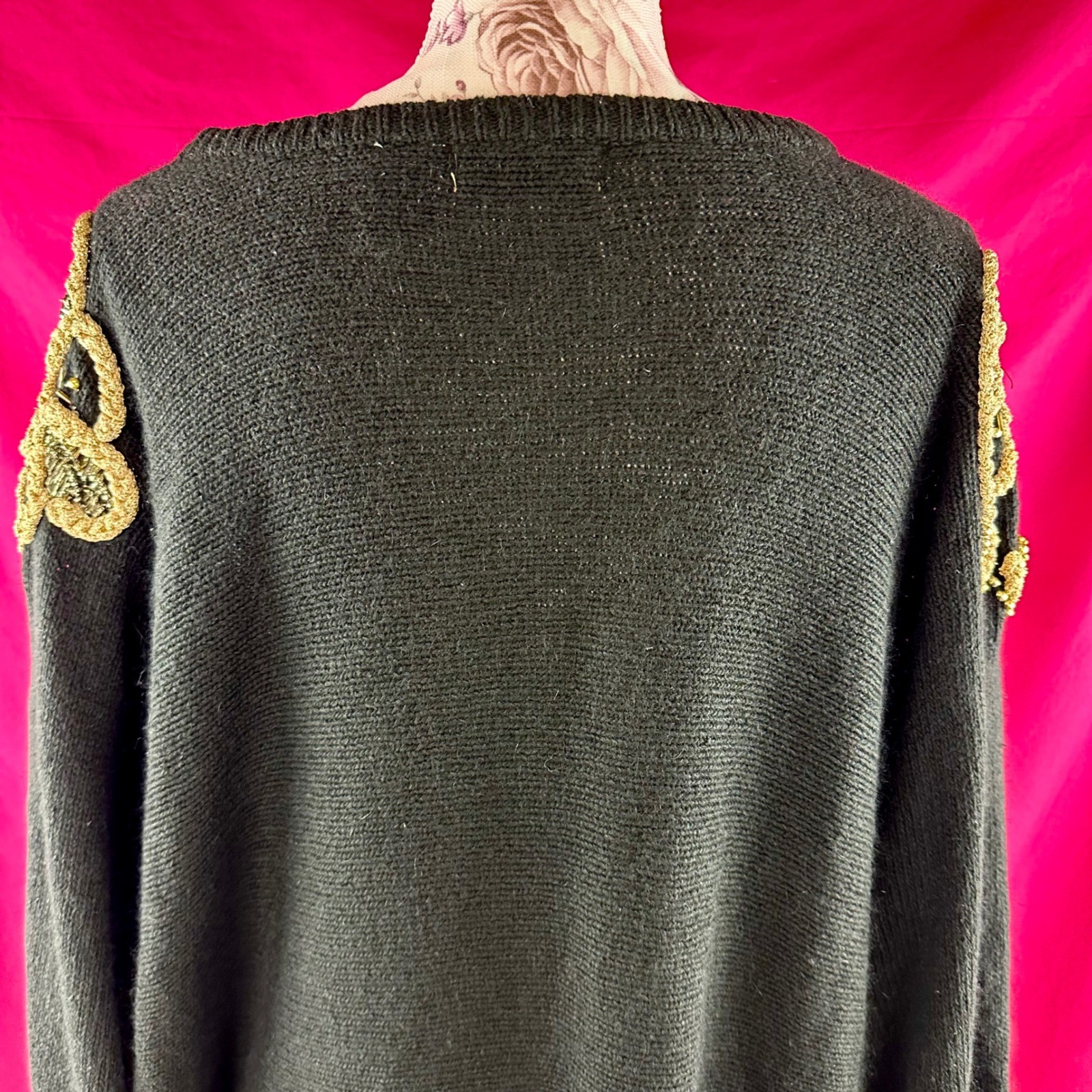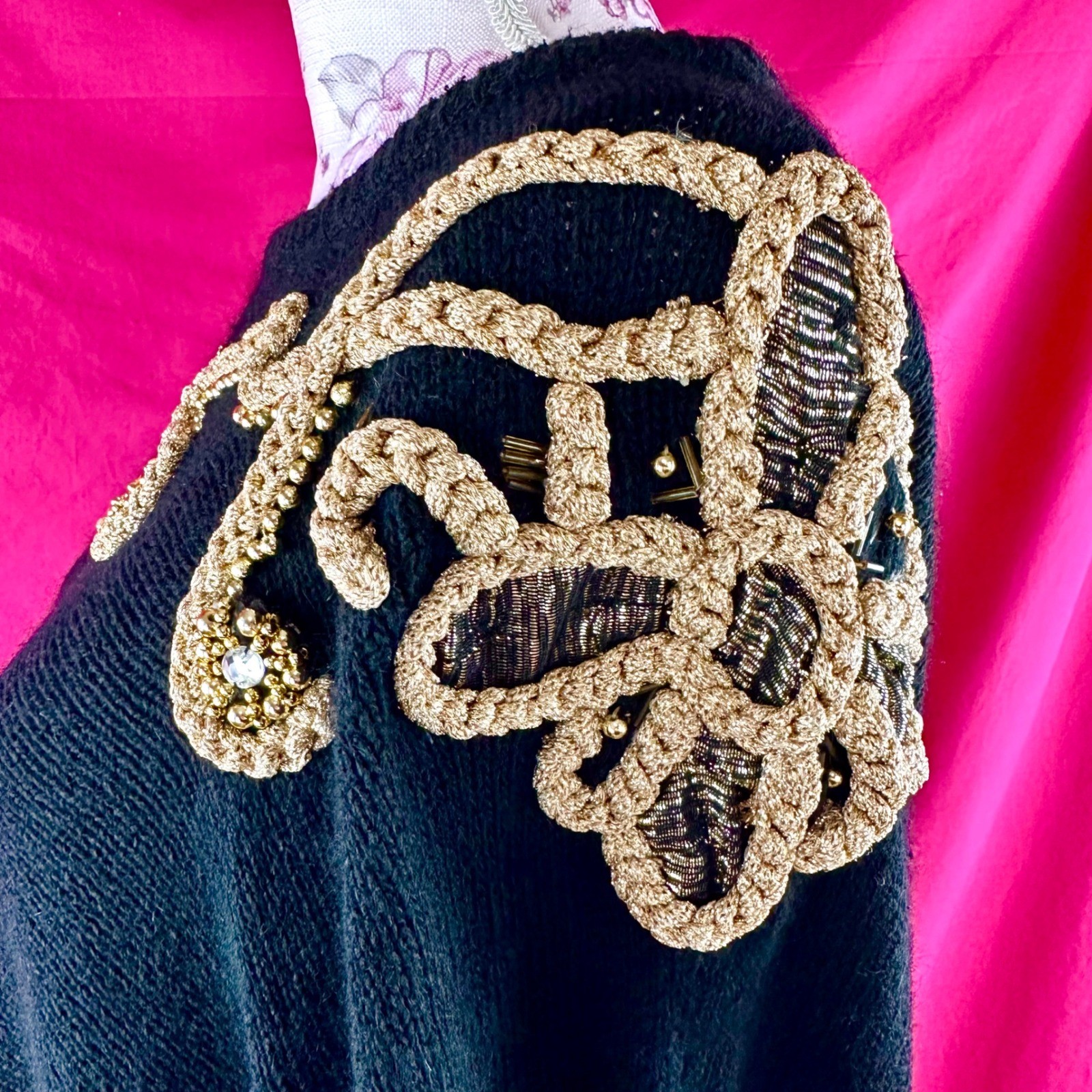 Vintage 80s Beaded Rhinestone Sweater Black Gold Angora Silk Wool NYE Plus 26/28