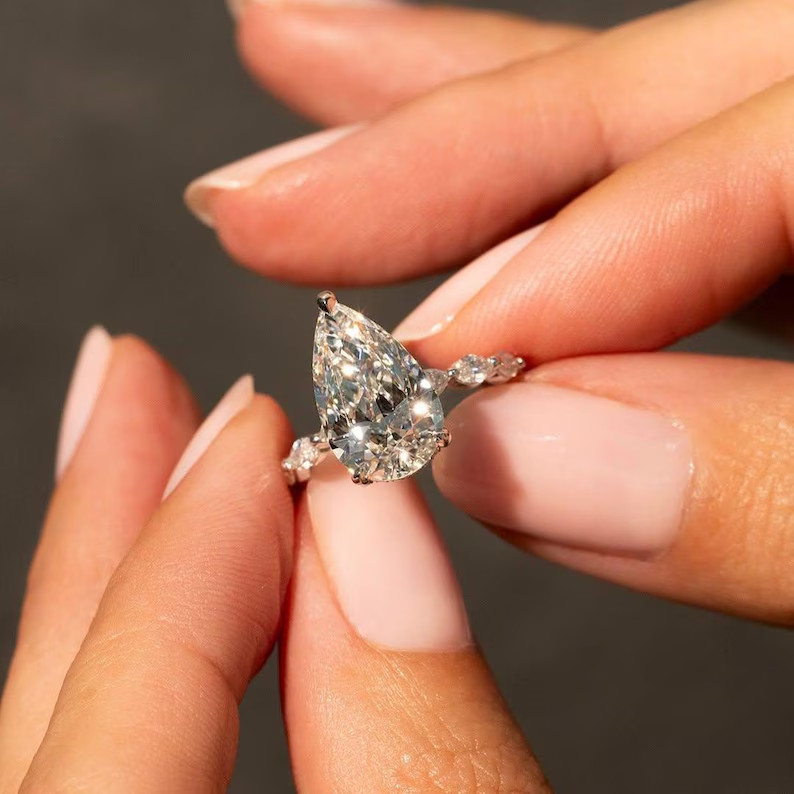 как выглядит 3.00Ct Pear-Cut VVS1 Moissanite Solitaire Engagement Ring 14k White Gold Plated фото