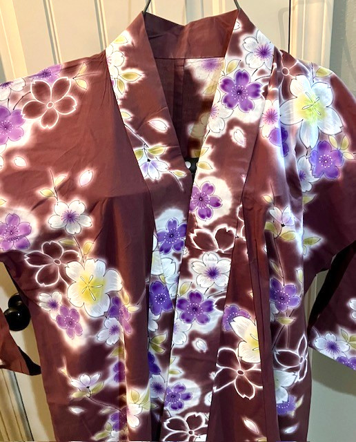 • Vintage Japanese Ladies Kimono Kansai Yukata Brown, Purple Yellow Flower Cotton