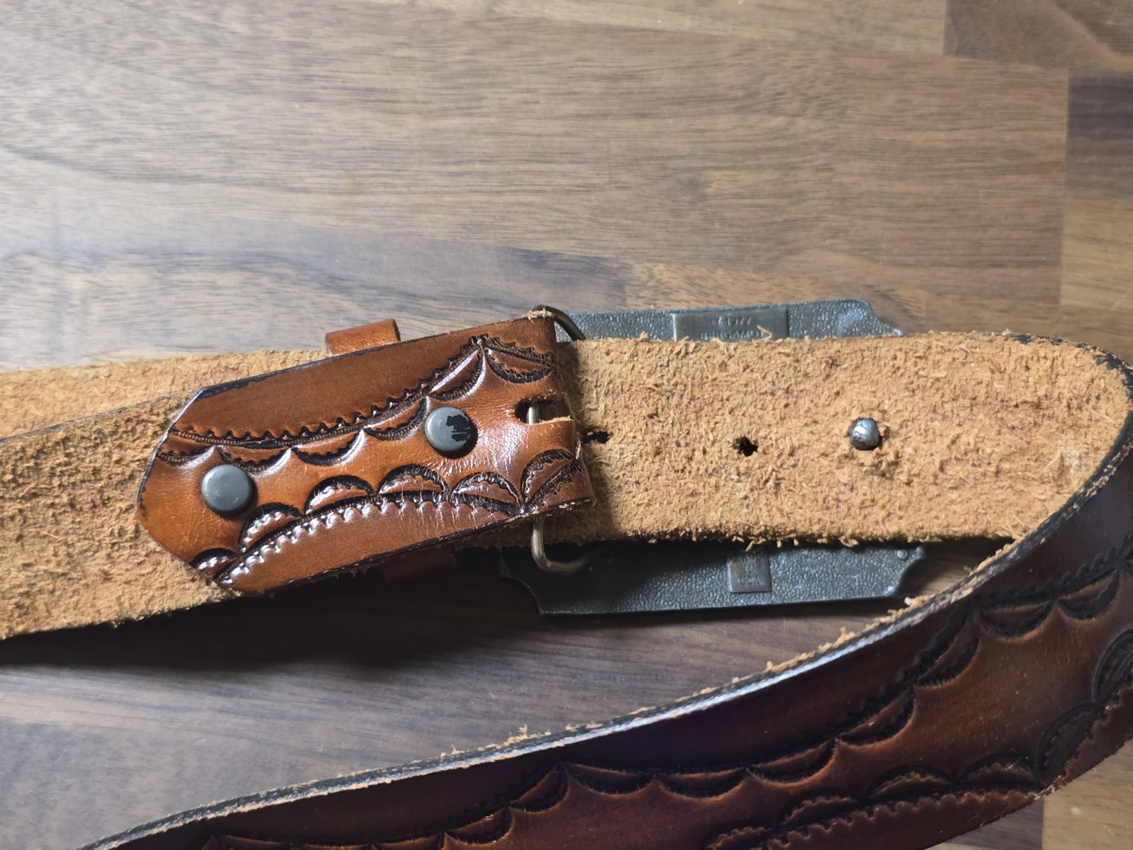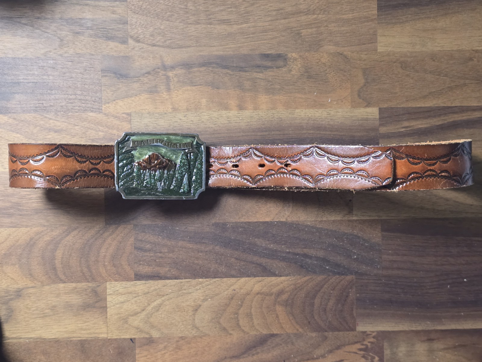 как выглядит Vintage 1977 Bergamot Brass Works CALIFORNIA Belt Buckle Half Dome Leather Belt фото