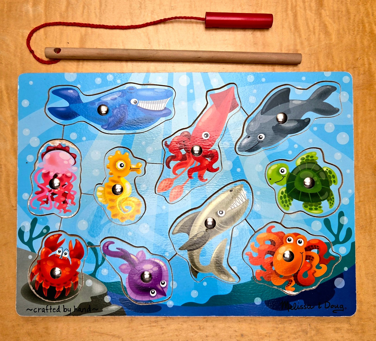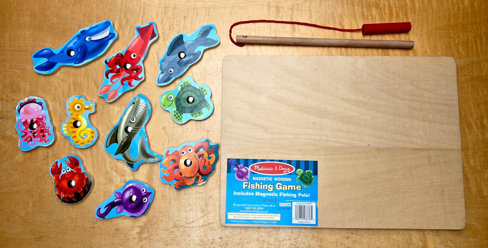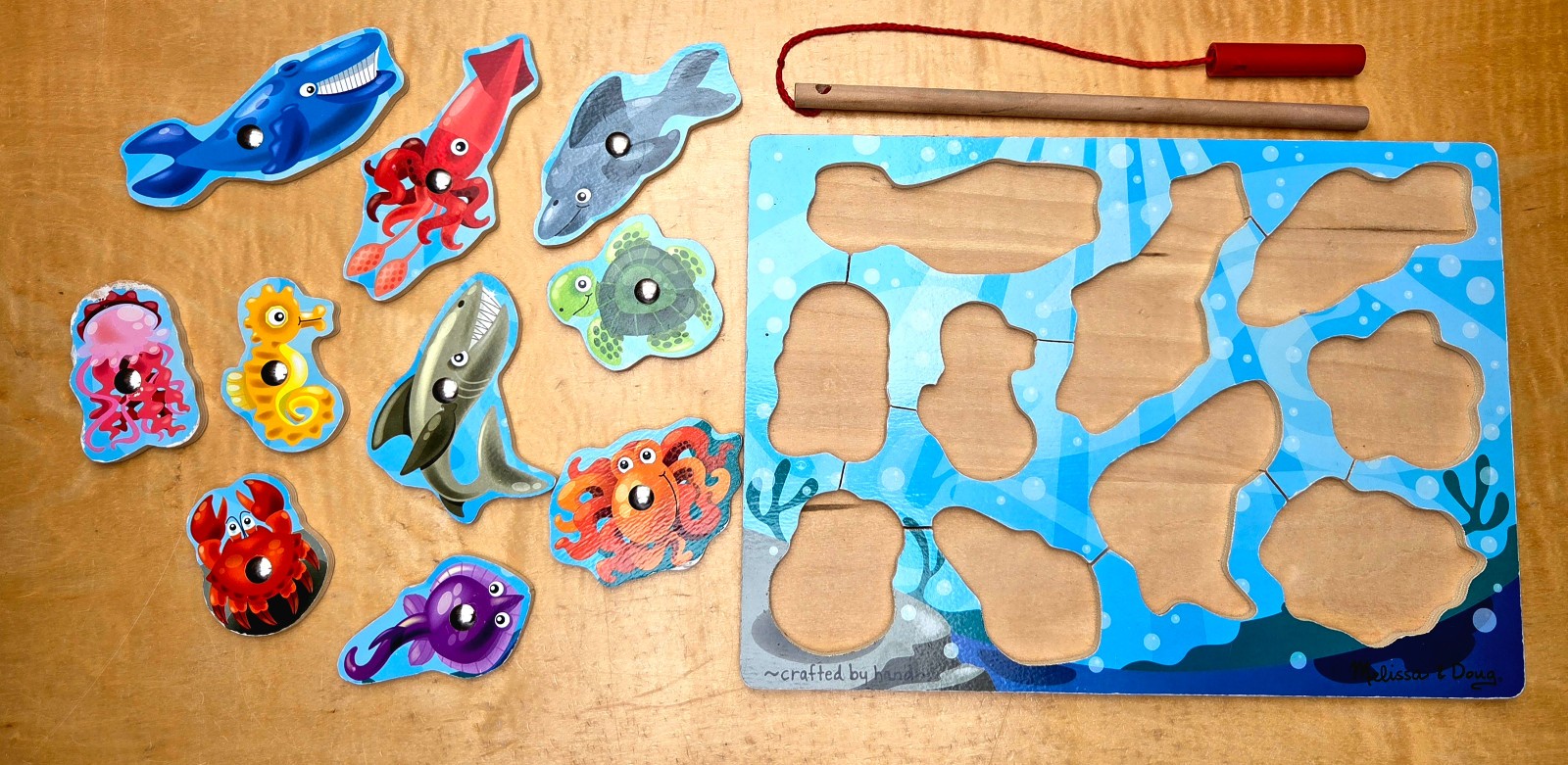 как выглядит Melissa Doug Wooden Puzzle Magnetic Fishing Game with Fishing Pole 10-pieces фото