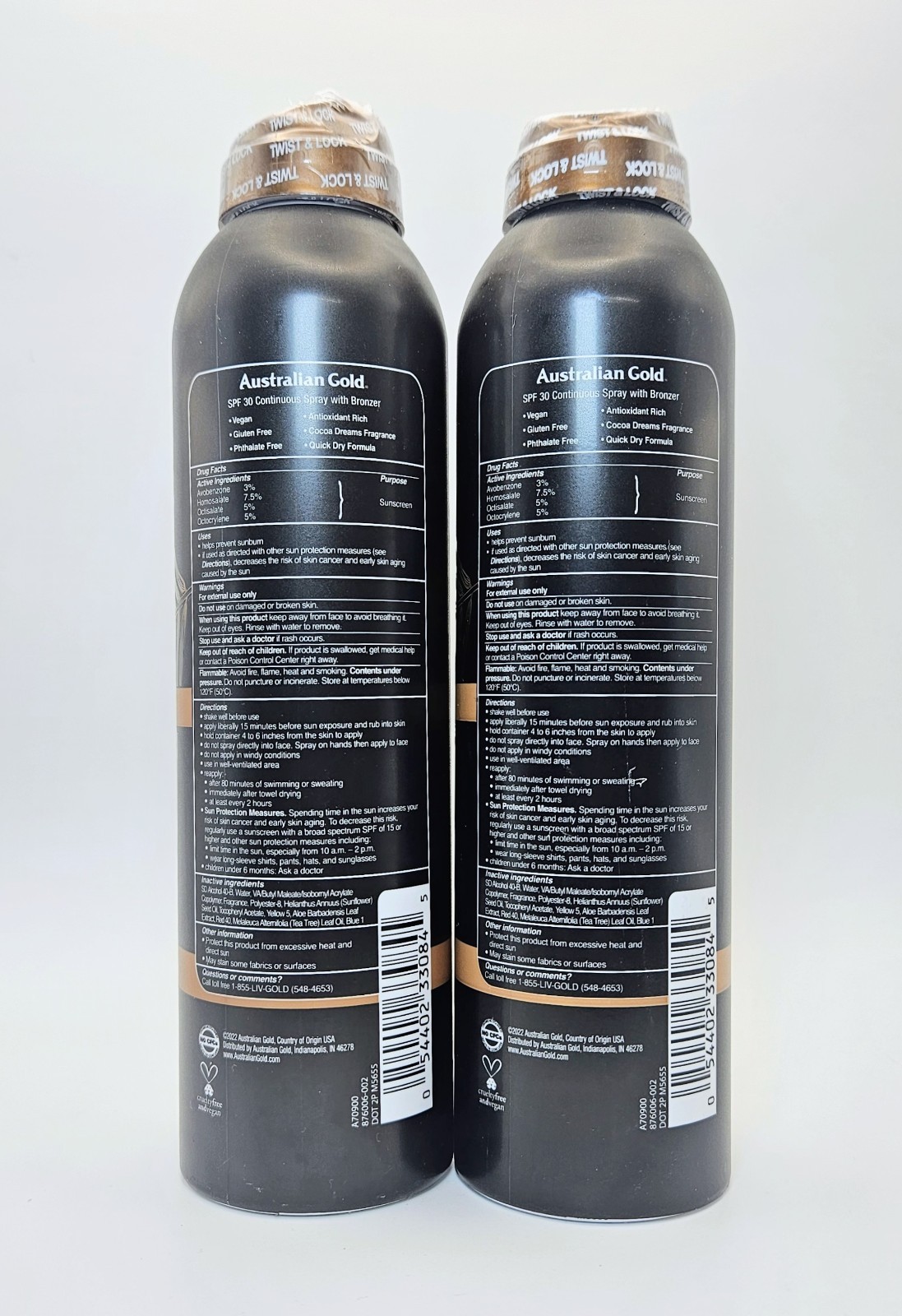 x2 Australian Gold Instant Bronzer SPF 30 Continuous Spray Sunscreen 6 oz each