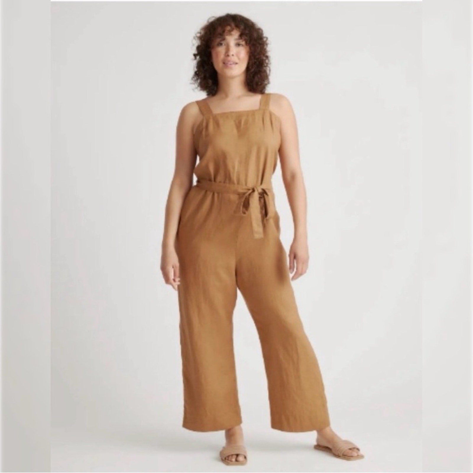 как выглядит Quince Square Neck Linen Jumpsuit Large Camel Brown Casual Minimalist Neutral фото