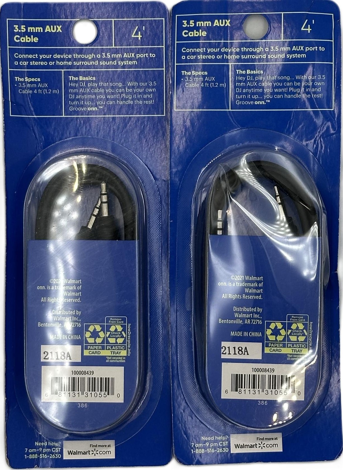 2-Pack onn. 4 foot 3.5mm Auxiliary Audio Cable Male to Male Stereo Black