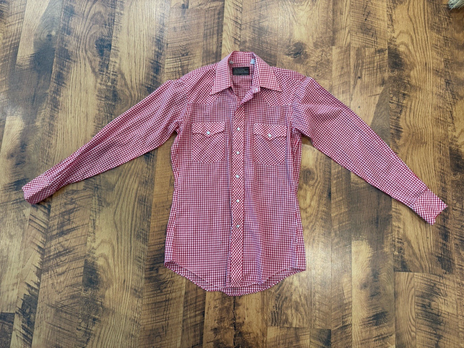 Vintage 60s-70s JC Penney Western Red Gingham Pearl Snap Shirt Size 14.5 Small