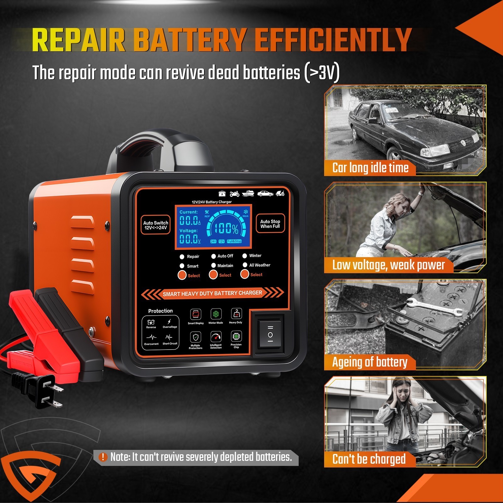 • 12V 24V Car Battery Charger Heavy Duty, 0-15A Automatic Battery Maintainer NEW