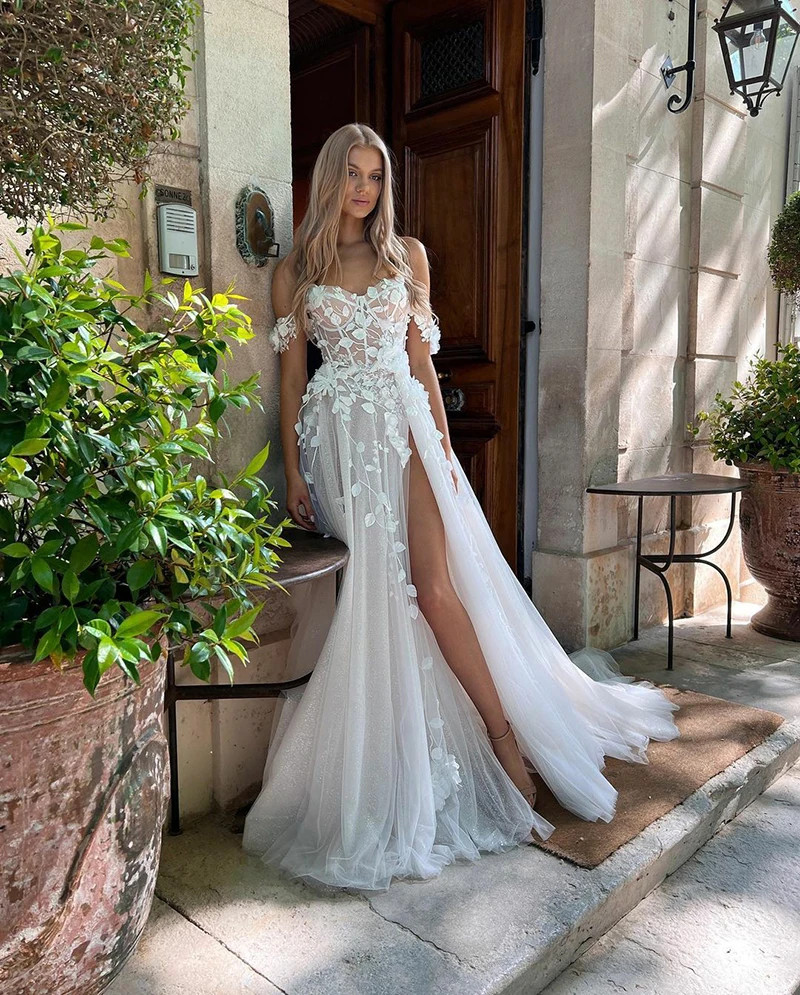 3D Flowers Wedding Dresses Off Shoulder Sweetheart Neck Side Split Bridal Gowns