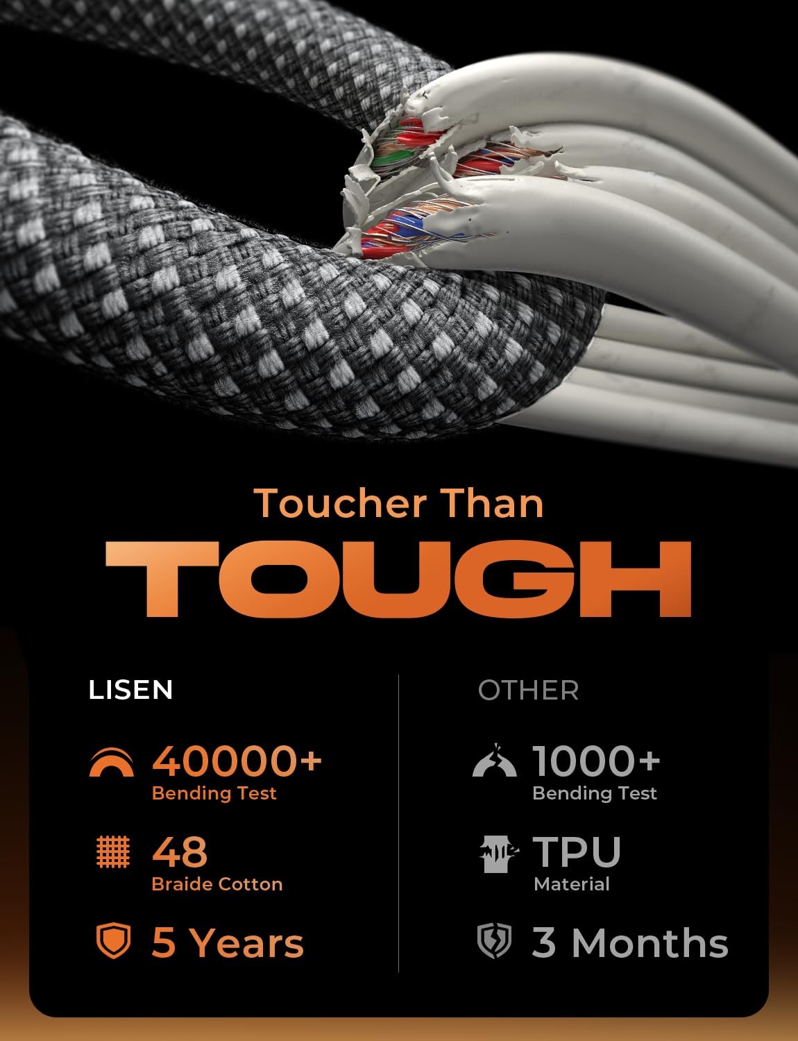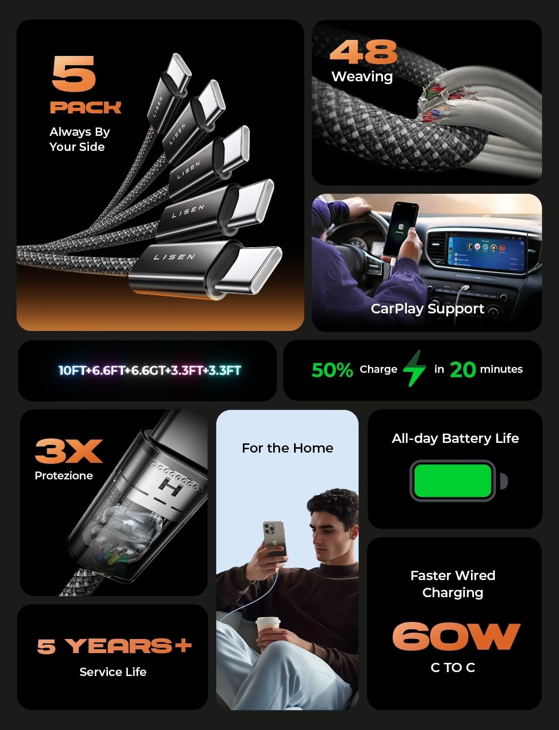 LISEN USB C to C Cable, 5-Pack 3.3 3.3 6.6 6.6 10FT, Black