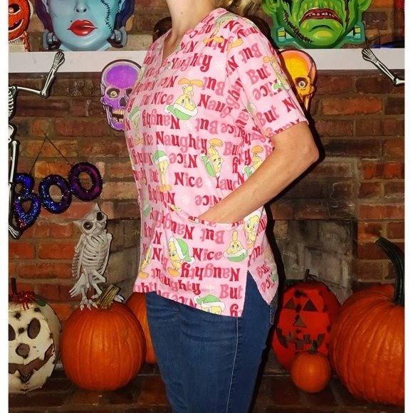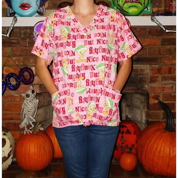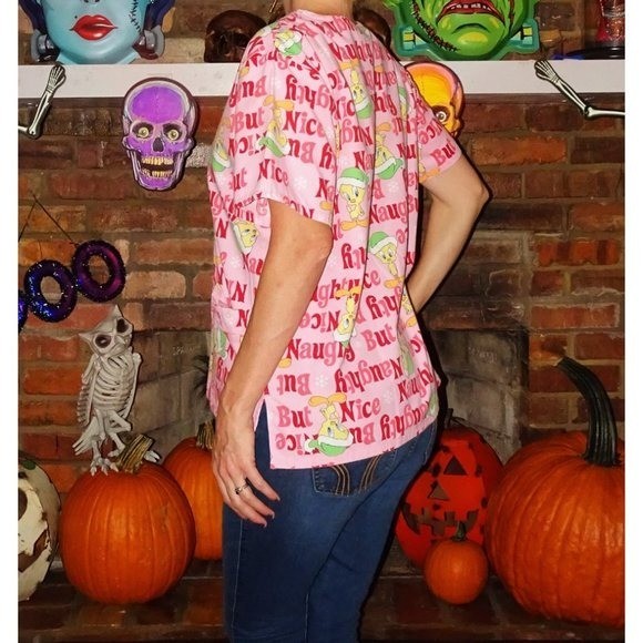 Tweety Bird Naughty but Nice Christmas Scrub Top M medical scrubs nurse vet tech
