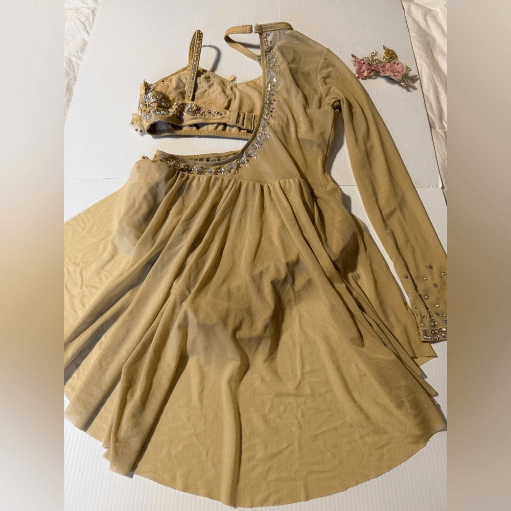 Glamour solo dance costume tan pastel rhinestone 2 piece XLC-Extra large child