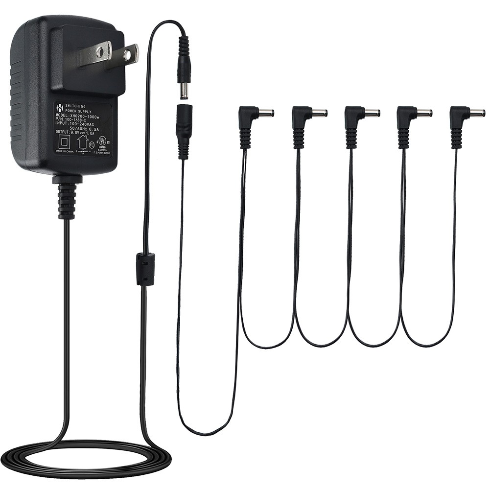 Guitar Pedal Power Supply Adapter 9V 1A Tip Negative 5 Way Daisy Chain Cables