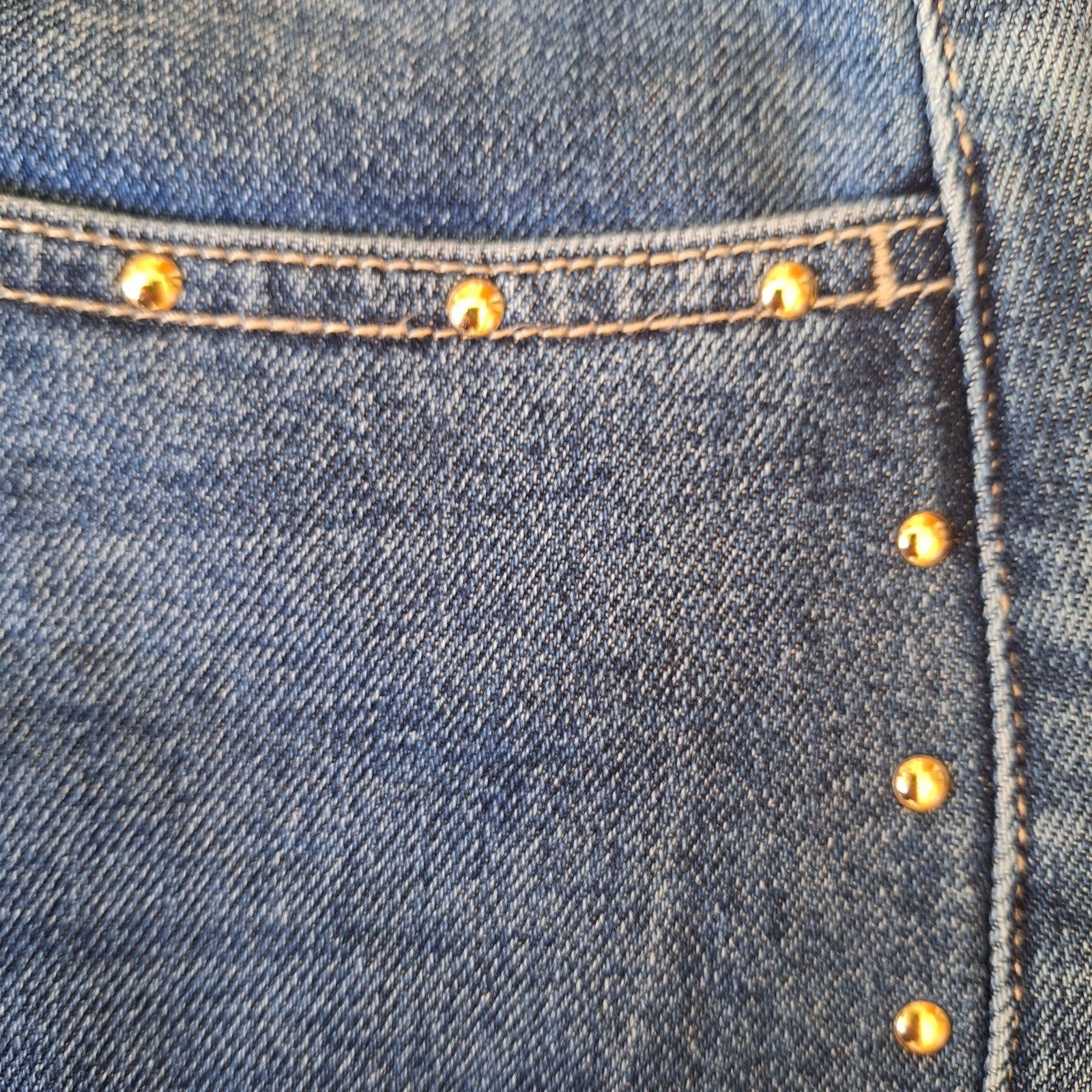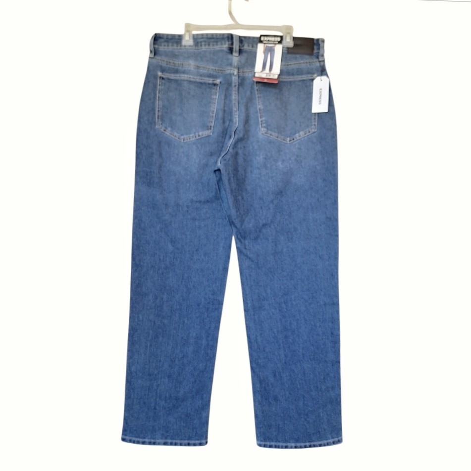 как выглядит EXPRESS Straight Leg High Rise Med Wash Gold Studs 14 фото
