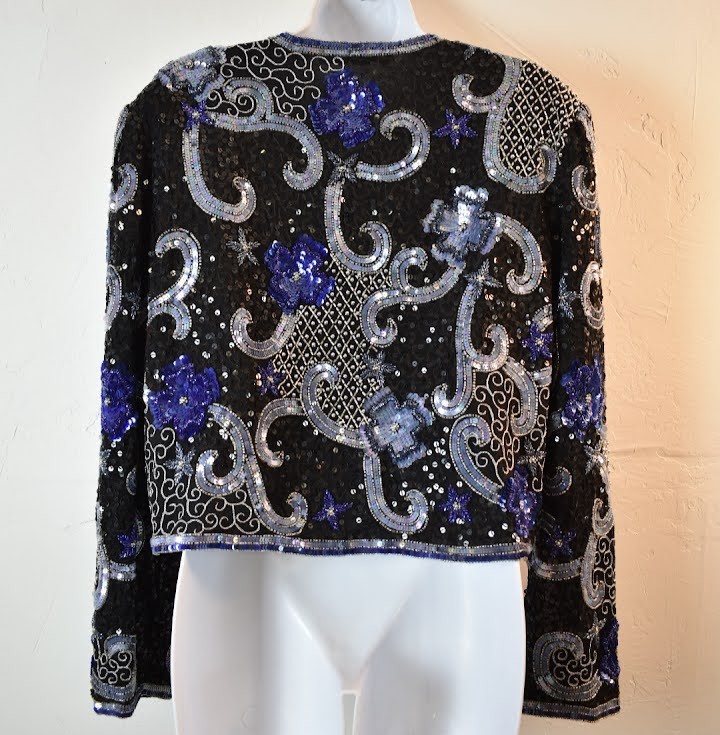 Vintage 1980s Scala Blue and Silver Sequin Encrusted Silk Jacket