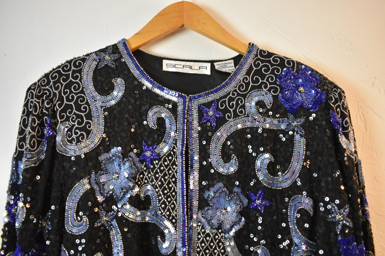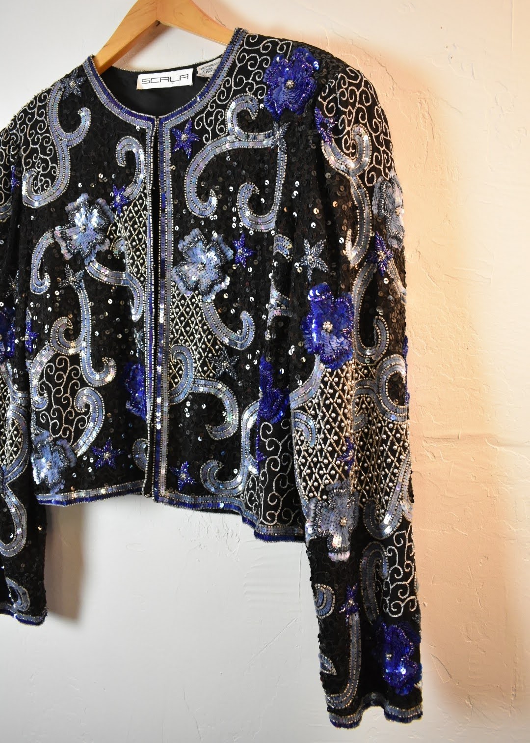 как выглядит Vintage 1980s Scala Blue and Silver Sequin Encrusted Silk Jacket фото
