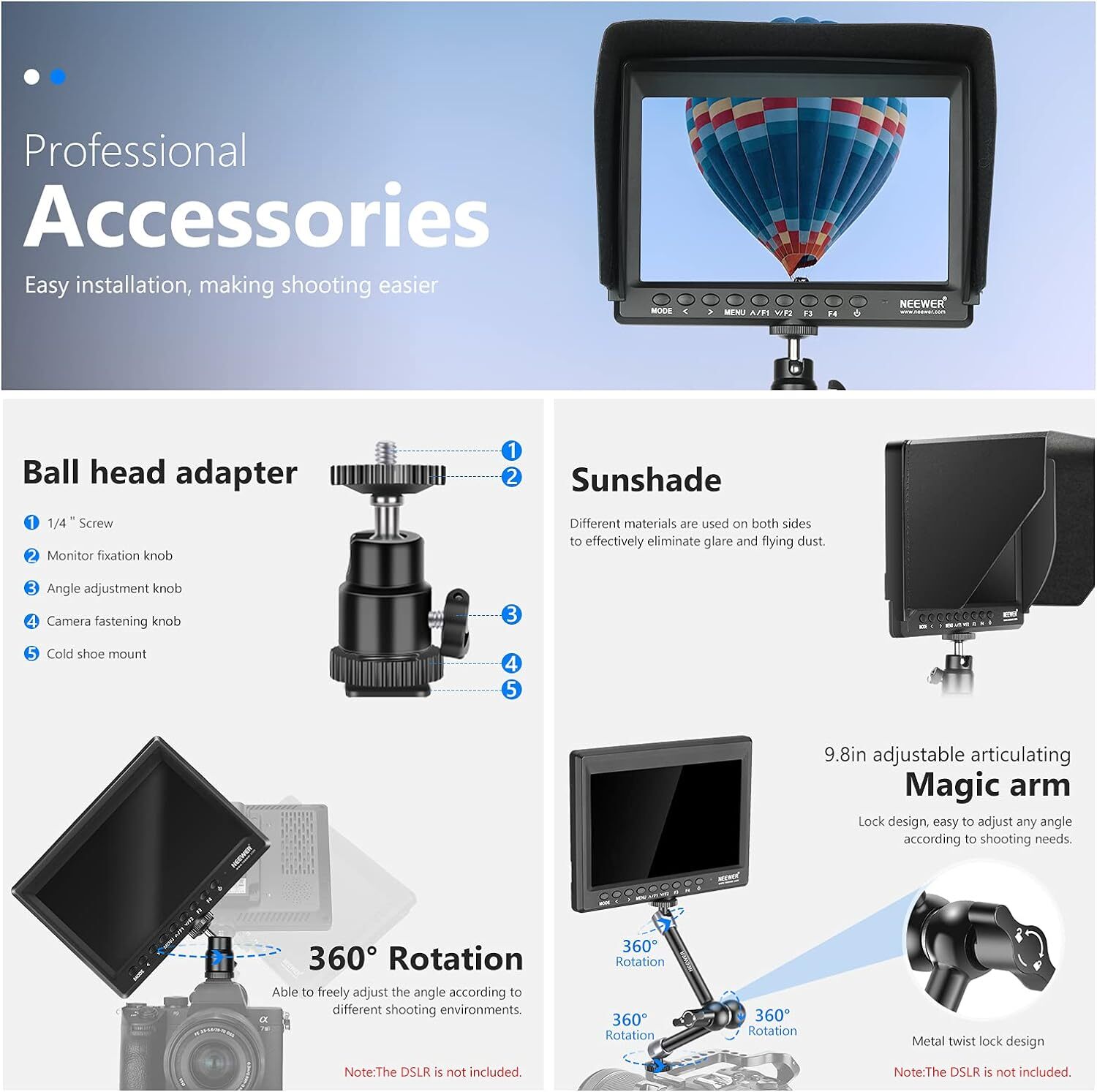 как выглядит Neewer F100 7 inch Camera Field Monitor HDMI Input with Sunshade and Ball Head фото