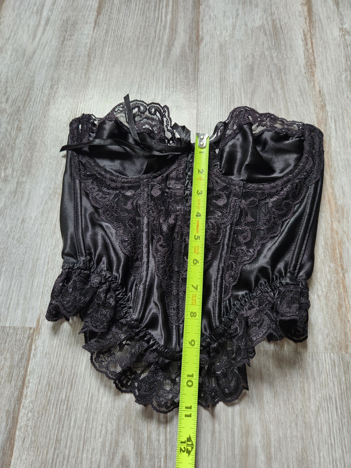 как выглядит VTG Victoria s Secret Gold Crown Corset 32B Black Lace Satin Sheer Bustier EUC фото