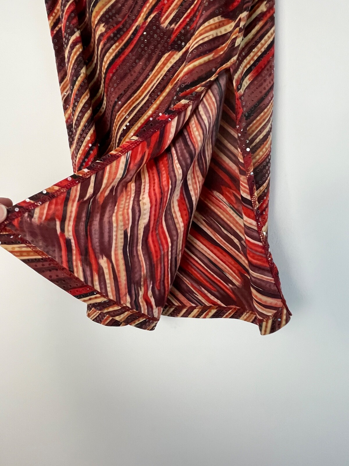 Vtg 90s Rampage Stretch Midi Skirt Size Medium Red Brown Lines Shiny Slit USA