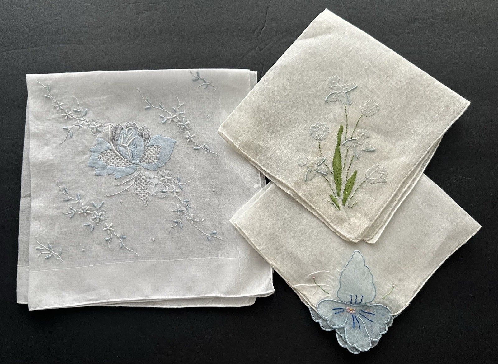 Vintage Lot 3 White Pale Blue Hankies Madeira Embroidered Linen Cotton NOS Tags