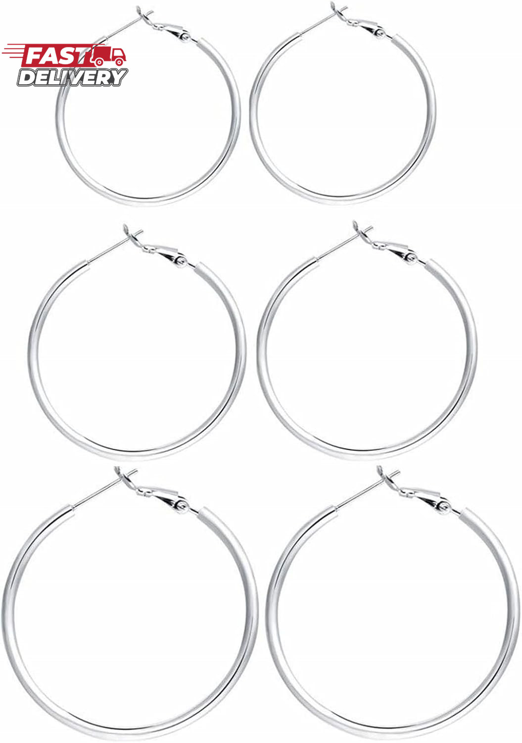 3 Pairs Sterling Silver Hoop Earrings, 14K White Gold Plated Big Hoop Earrings S