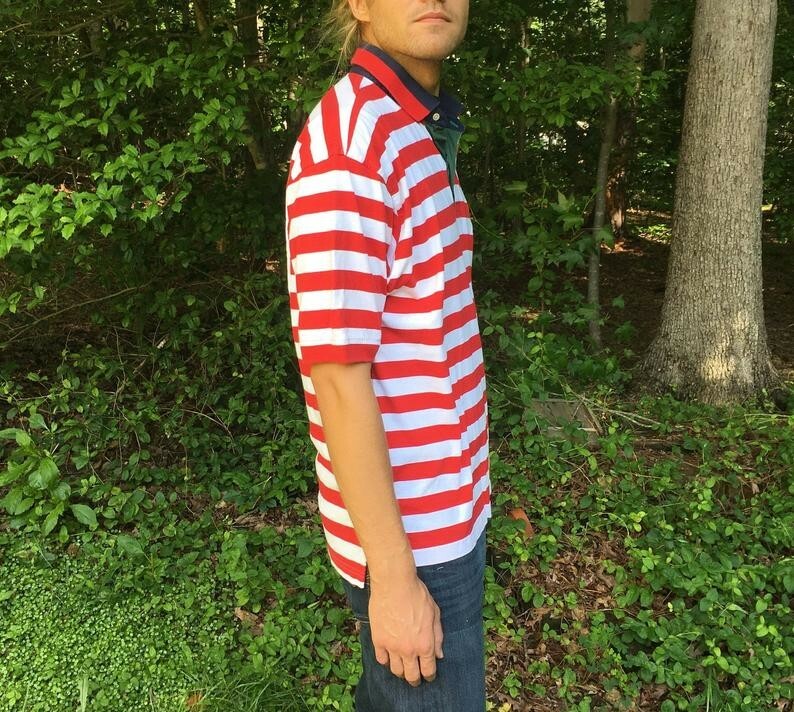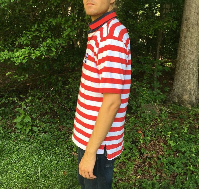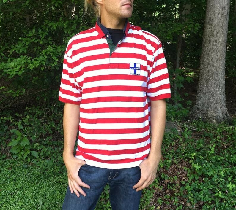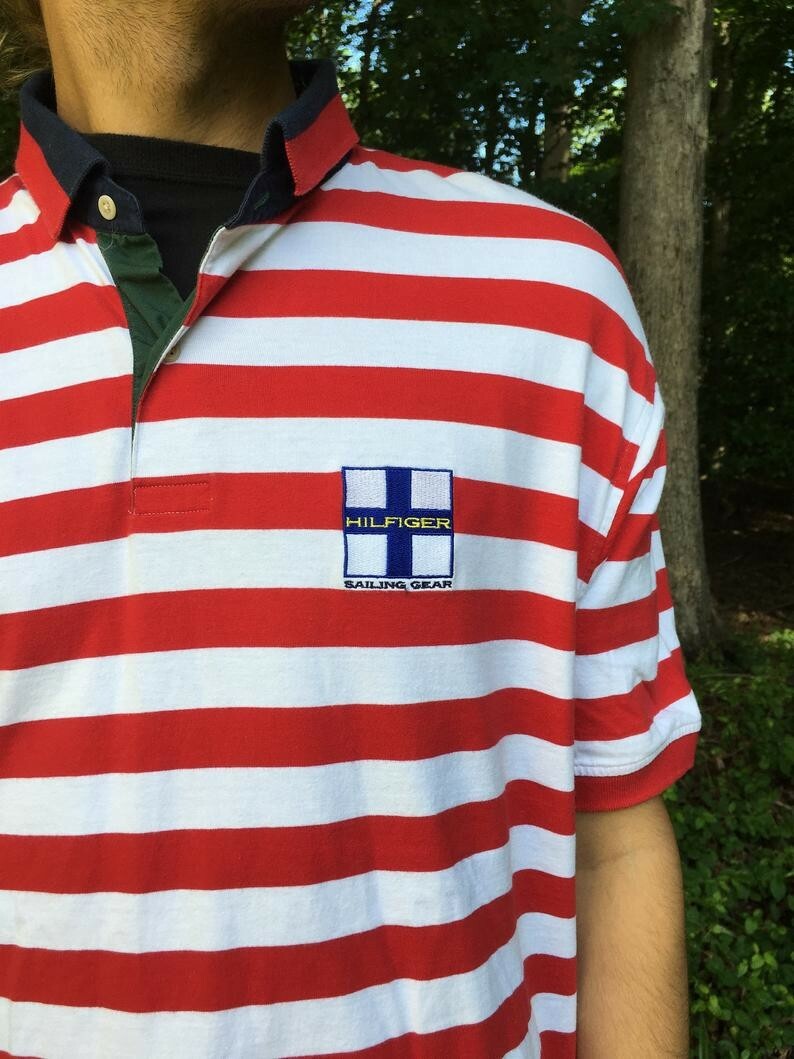 как выглядит VTG 1990 TOMMY HILFIGER Sailing POLO SHIRT Nautical Flag LOGO Stripe MEN SIZE XL фото