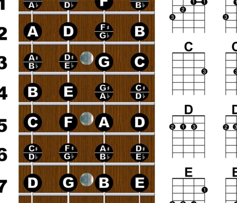 Ukulele Fretboard Notes Chord Chart Instructional Poster GCEA Tuning Easy Uke