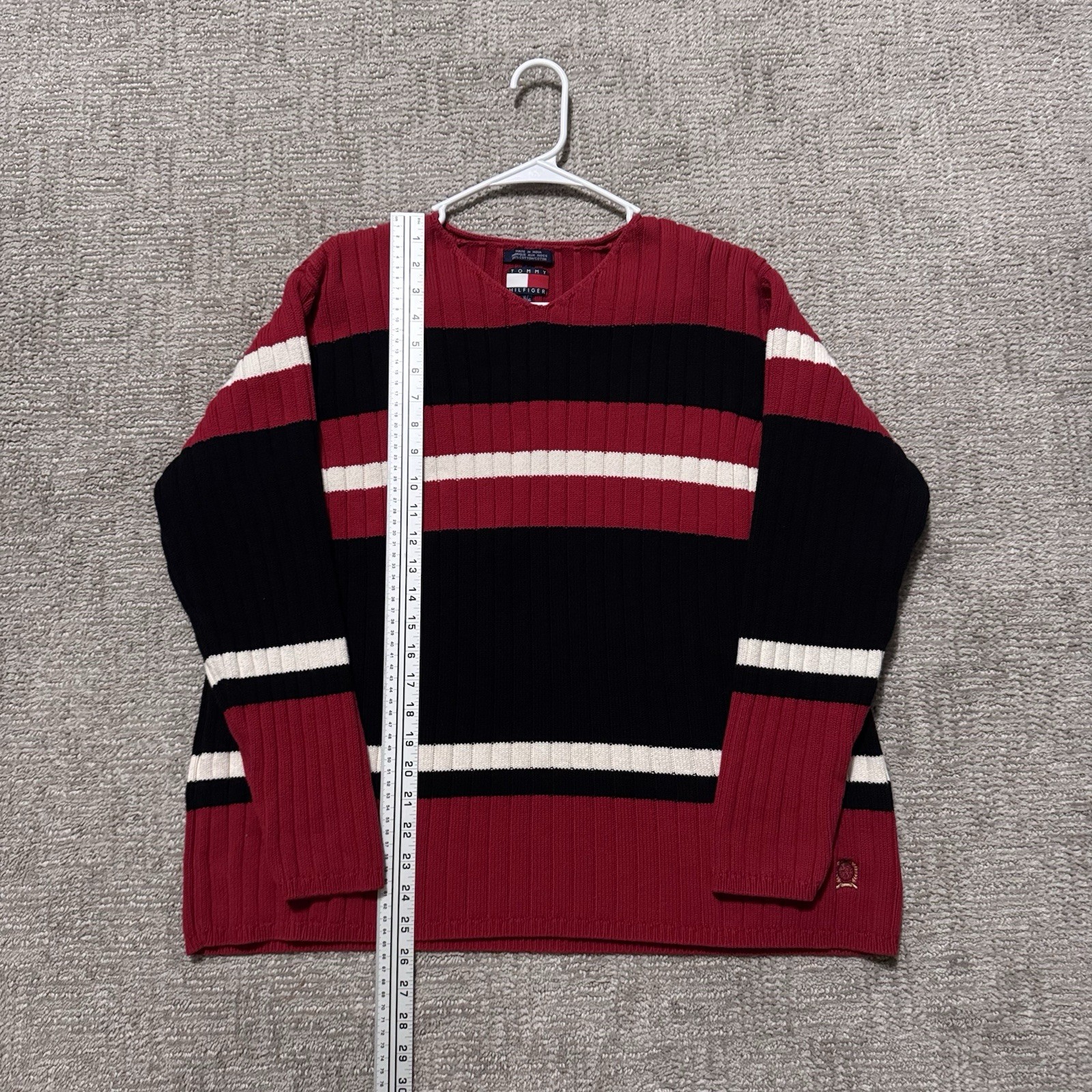 как выглядит Vintage Tommy Hilfiger Sweater Mens XL Red Striped Cotton Crewneck 90s Flag Logo фото