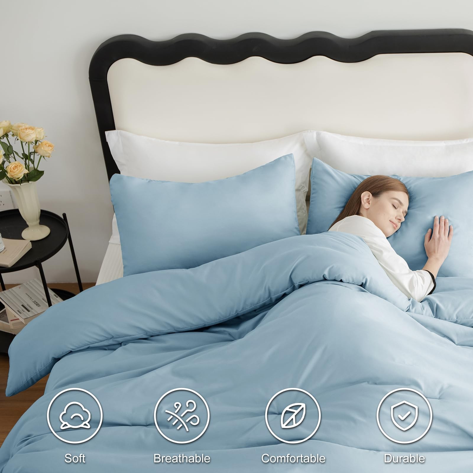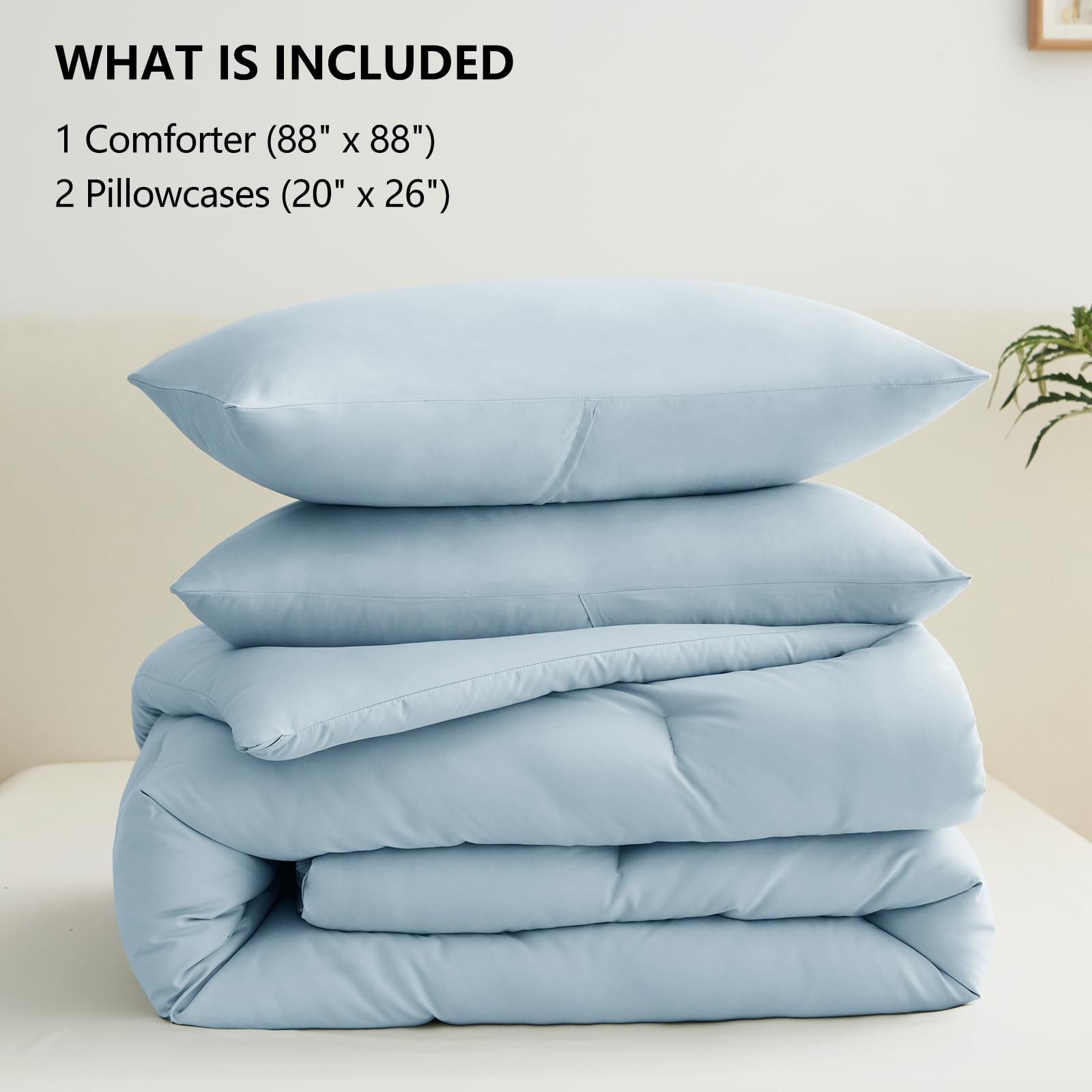 Queen Comforter Set Light Blue, 3 Pieces Solid Comforters Queen Size Breathab...