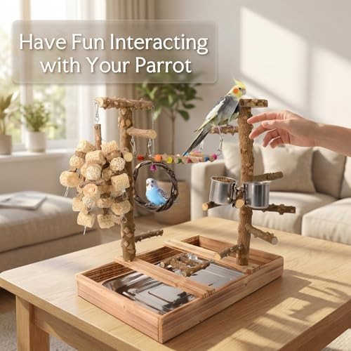 Natural Wood Bird Perch Stand - Multi-Layer Parrot Gym with Toys Feeding Cups,