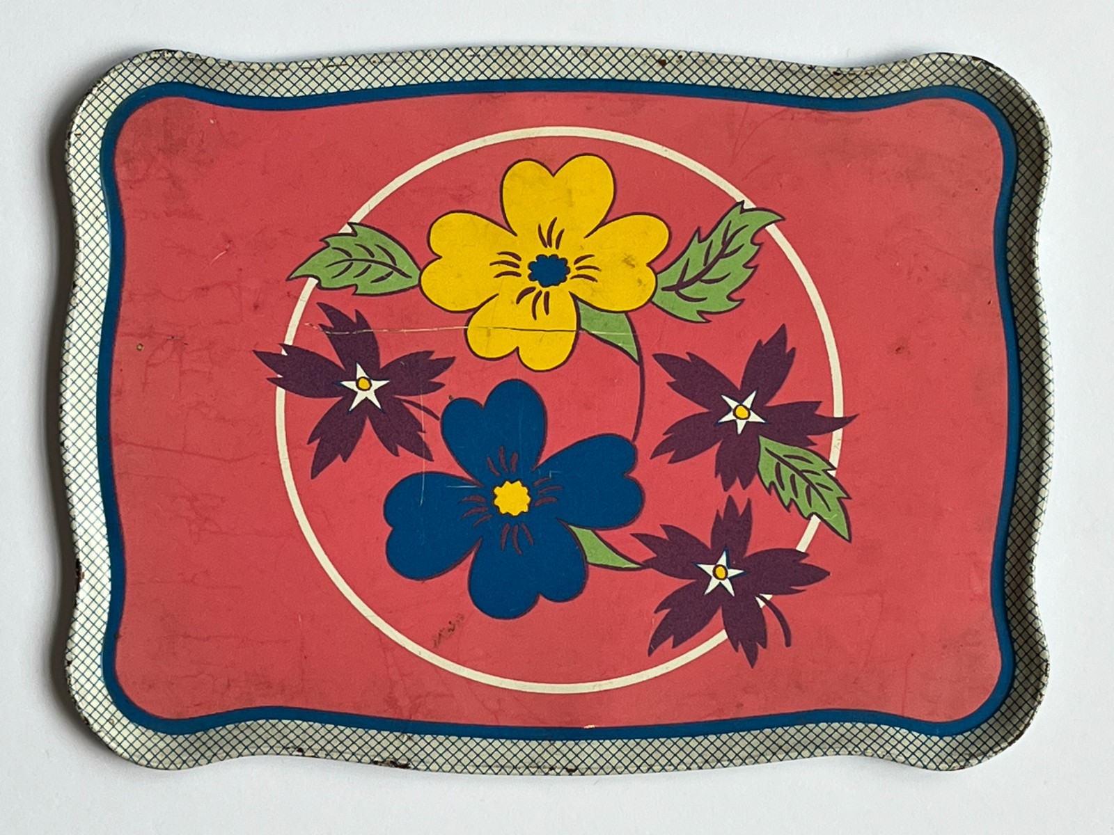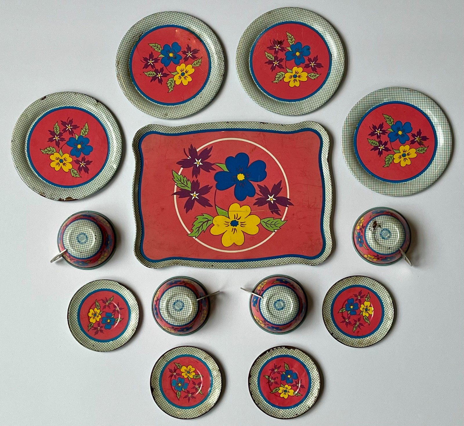 Vintage OHIO ART Tin Litho Child's Tea Set FLOWERS FLORAL PINK BLUE 13 Pieces