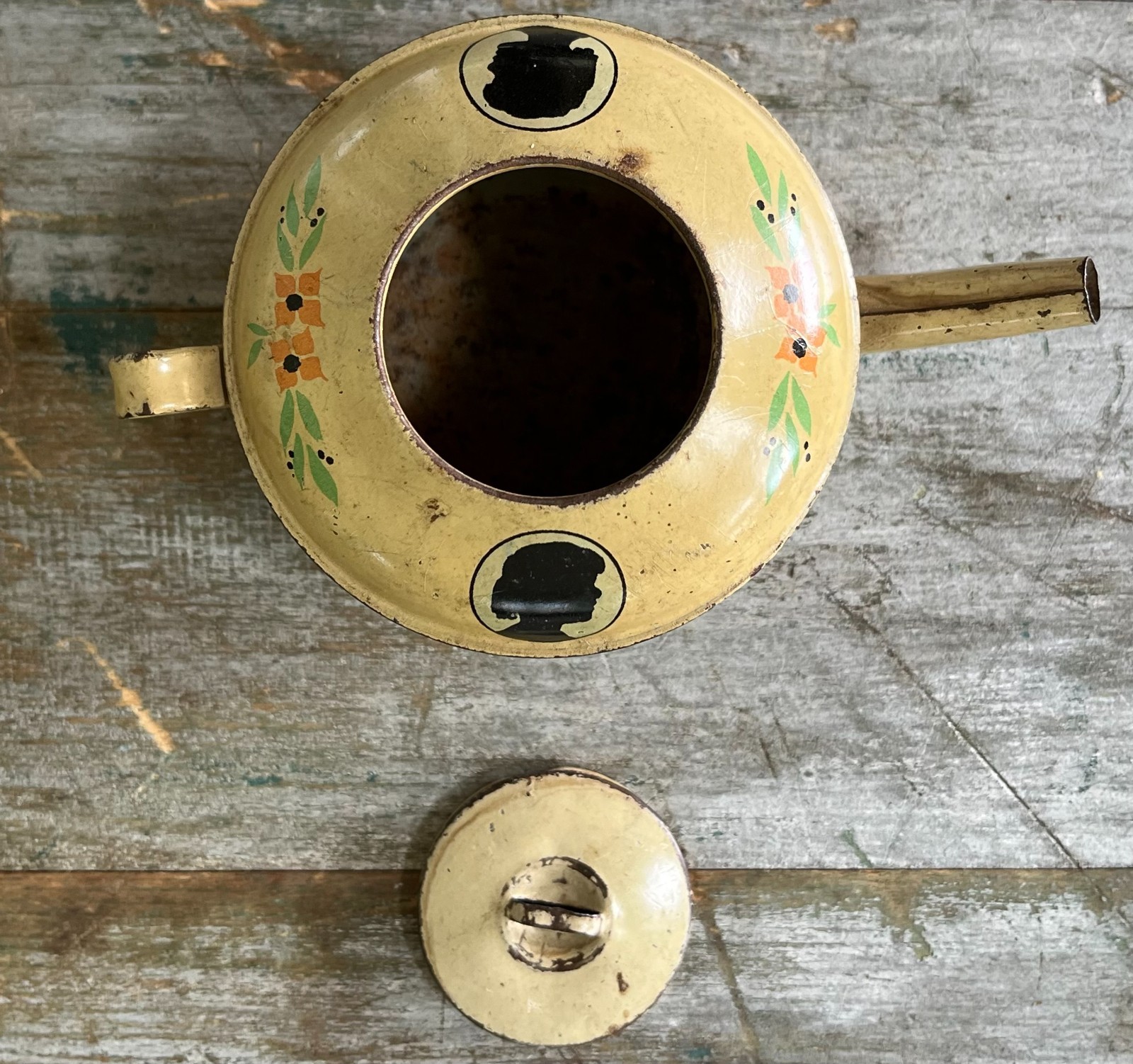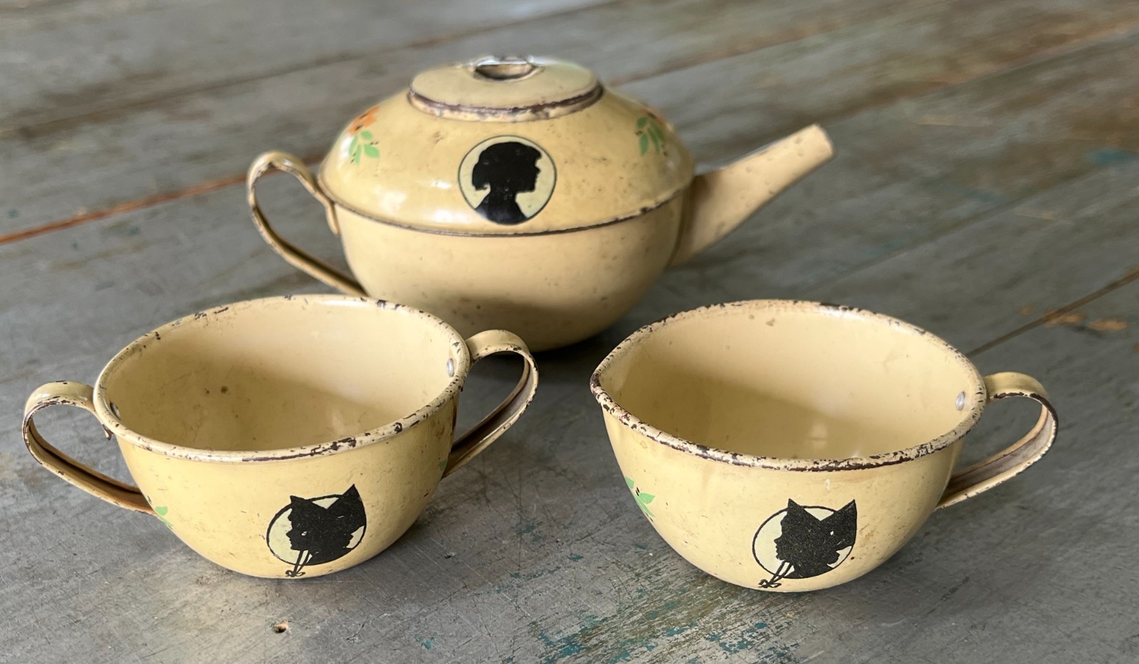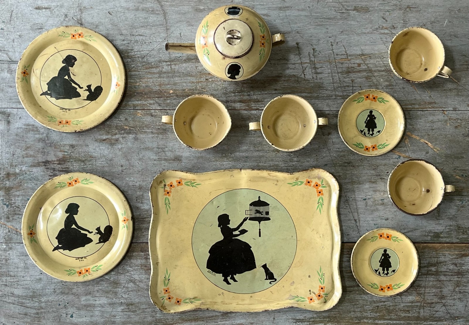 RARE Antique Ohio Art Tin Litho Child's Tea Set 1930's Silhouette 11 Pieces