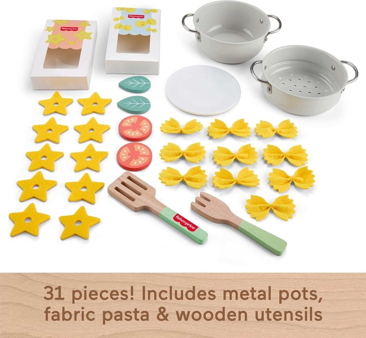 Fisher-Price Wood Pretend Cooking Set, Pots Pasta Chef, 31 Pieces Play Food 3