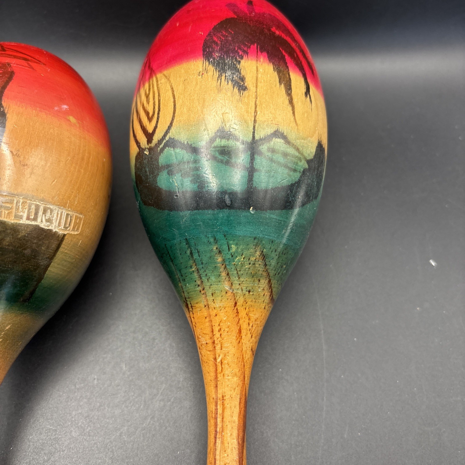 Hand Painted Wooden Maracas Pair Tropical Palm Tree Island Scene Percussion