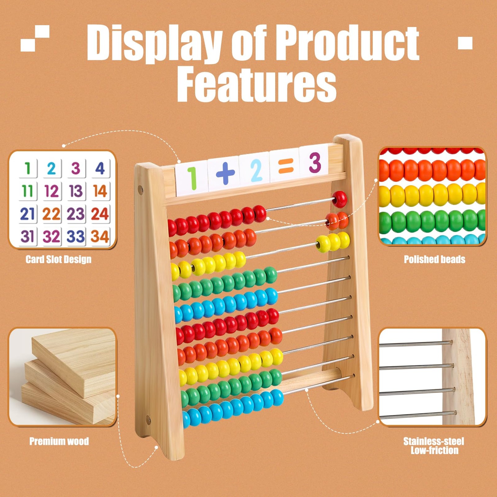 Wooden Abacus for Kids Math - 10-Row Counting Toy with 100 Beads, Number Card...