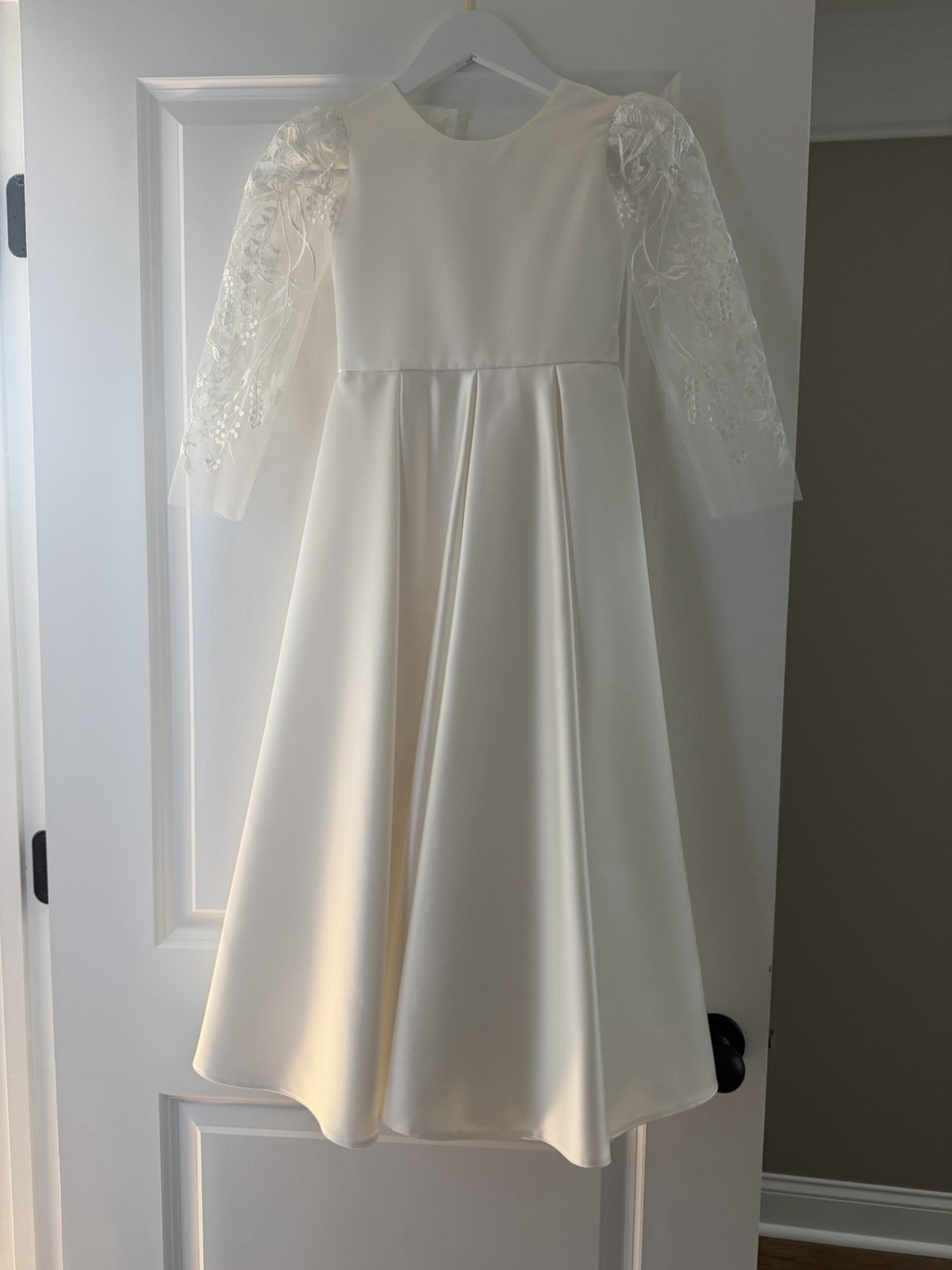 Handmade White Lace Satin Formal Dress with Bow, Size 7, Flower Girl, Communion