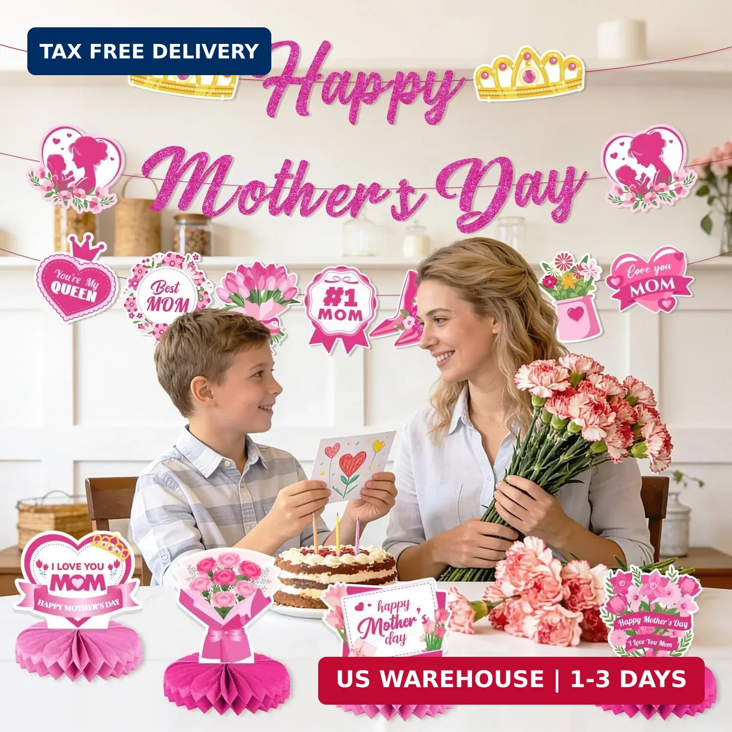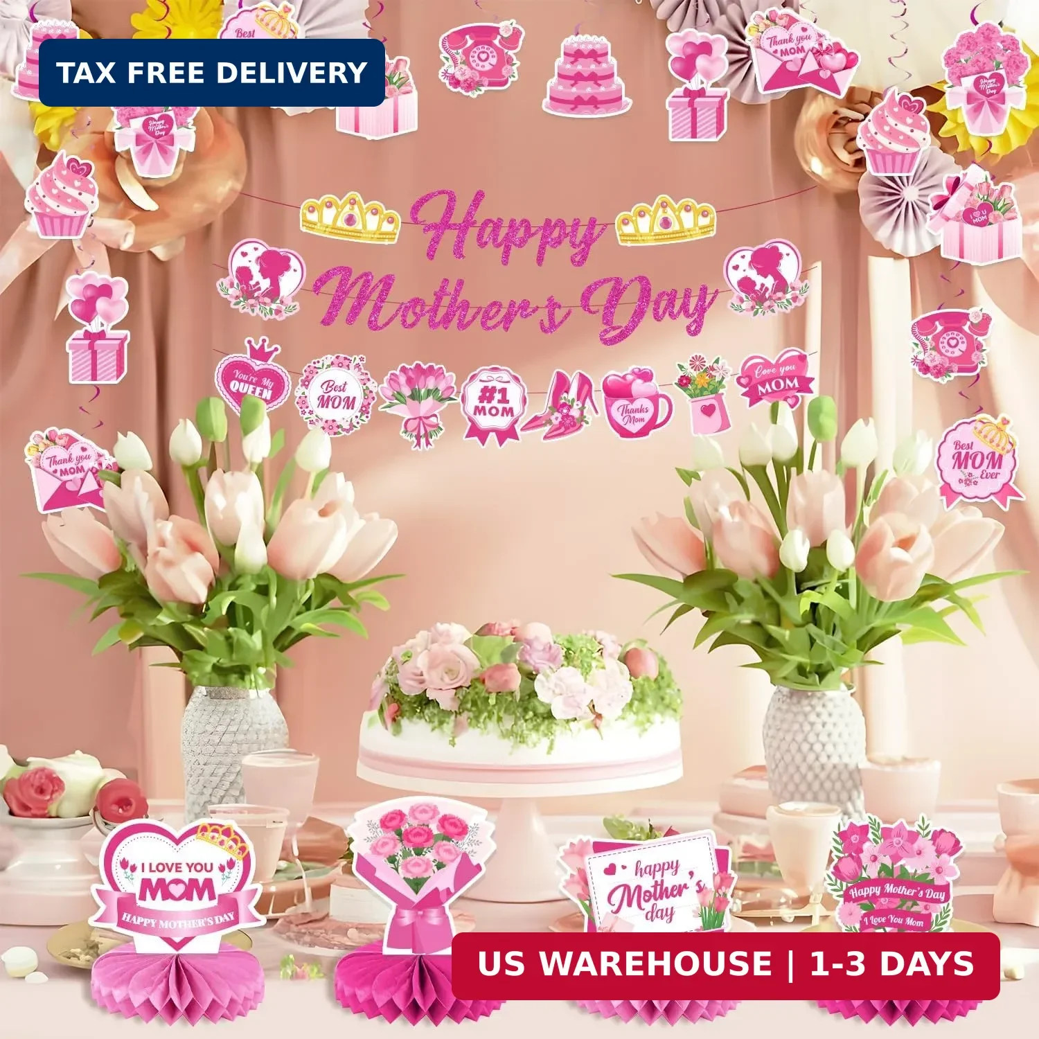 Mother's Day Decorations Set - Pink Glitter Happy Mother's Day Banner, Print Gar