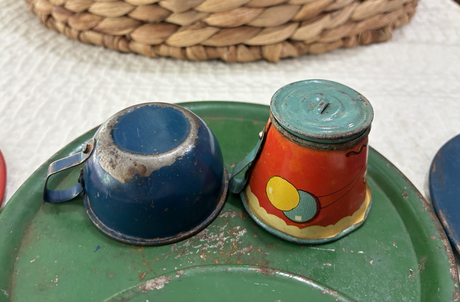как выглядит Vintage Mid Century Enamelware Metal Toy Plates Dinnerware Set фото