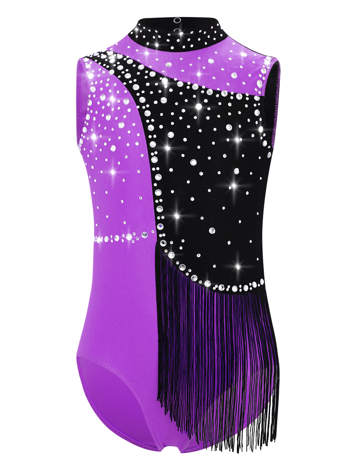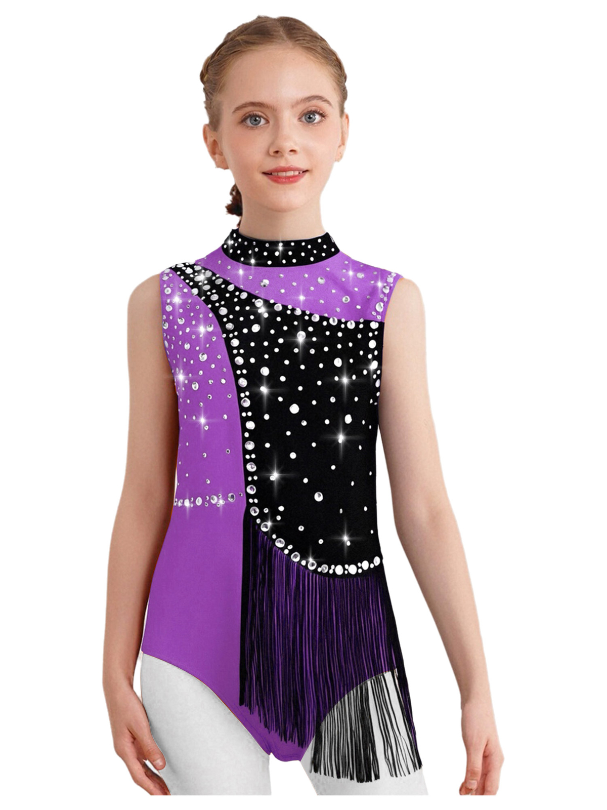 Kids Girls Sleeveless Tassel Leotard Latin Dance Dress Shiny Rhinestone Bodysuit