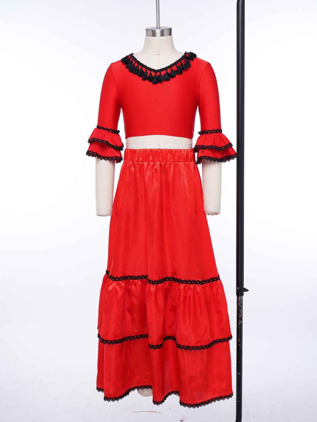 Girls 2-Piece Satin Costume Competition Flamenco Dance Traditional Tiered Skirt