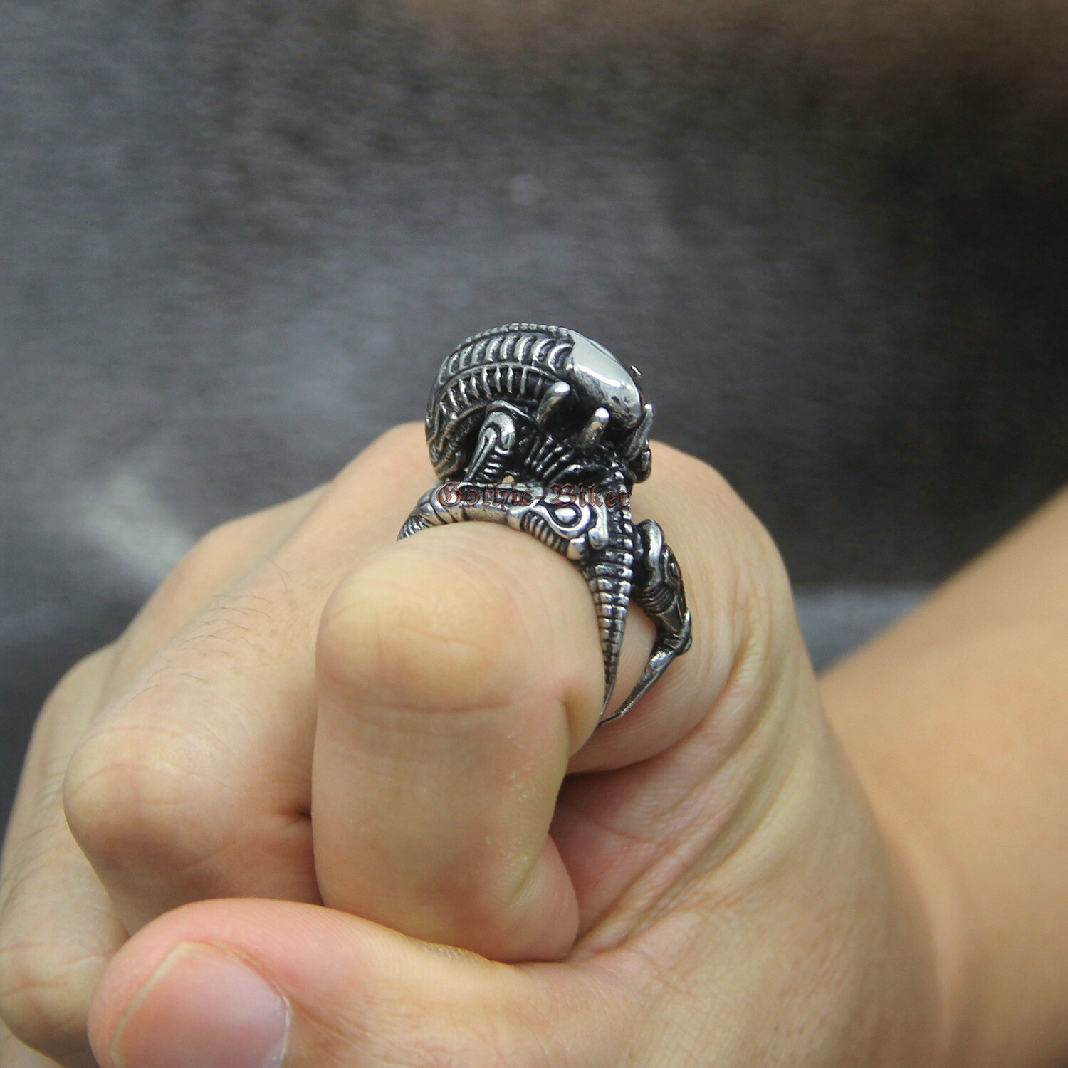 Men's 3D Black Silver Alien Skull Fierce Predator Stainless Steel Heavy Ring